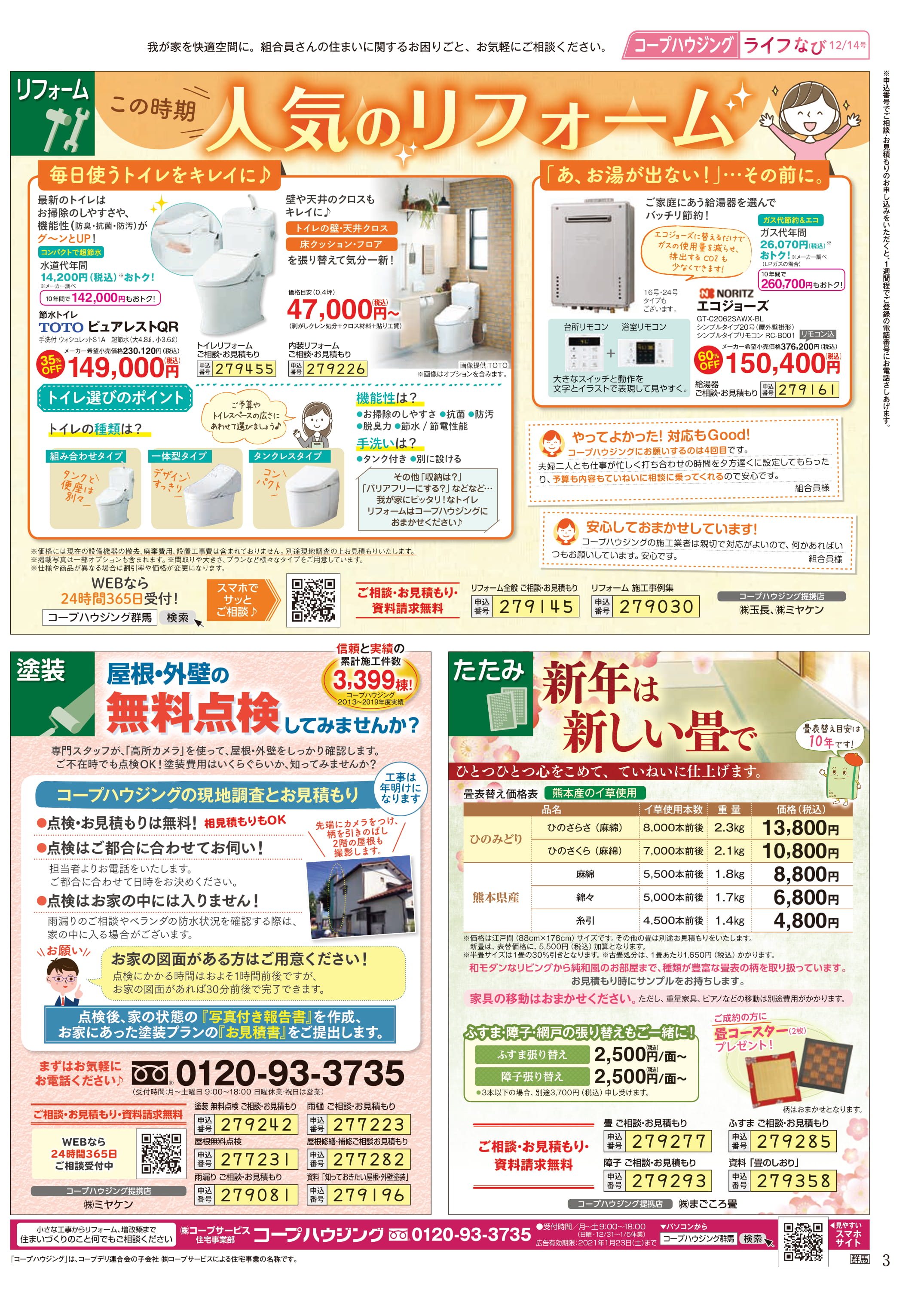 HOME毎月発行チラシ『ライフなび』群馬ライフなび 群馬 2020年12月14日号 ライフなび 群馬 2020年12月14日号 ライフなび 群馬 2020年12月14日号 毎月発行チラシ『ライフなび』一覧はこちら 施工事例 施工事例一覧 内装 外装 水回り 組合員の声 組合員の声一覧 カテゴリーなし お役立ち情報 暮らしに役立つ情報 リフォームメニュー表 毎月発行チラシ『ライフなび』 シロアリ防除について アフターフォロー お問い合わせ・お申し込みからお支払いまでの流れ よくある質問 お問い合わせ お問い合わせ 各エリアの情報はこちら 各エリア情報 東京 埼玉 千葉 茨城 群馬 長野 新潟 その他の情報はこちら チケット くらしのサービス 葬祭