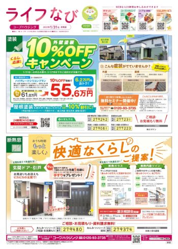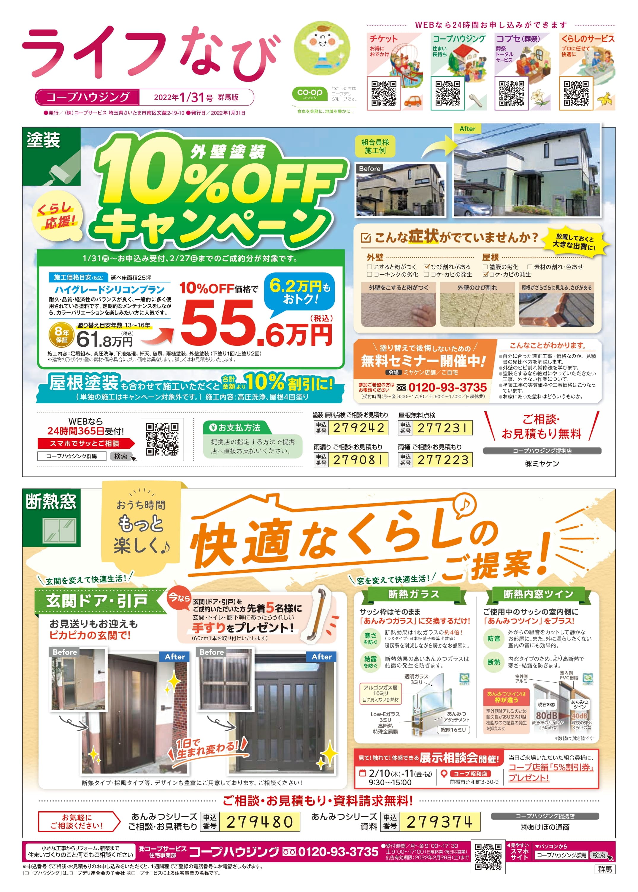 HOME毎月発行チラシ『ライフなび』群馬ライフなび 群馬 2022年1月31日号 ライフなび 群馬 2022年1月31日号 ライフなび 群馬 2022年1月31日号 毎月発行チラシ『ライフなび』一覧はこちら 施工事例 施工事例一覧 内装 外装 水回り 組合員の声 組合員の声一覧 カテゴリーなし お役立ち情報 暮らしに役立つ情報 リフォームメニュー表 毎月発行チラシ『ライフなび』 シロアリ防除について アフターフォロー お問い合わせ・お申し込みからお支払いまでの流れ よくある質問 お問い合わせ お問い合わせ 各エリアの情報はこちら 各エリア情報 東京 埼玉 千葉 茨城 群馬 長野 新潟 その他の情報はこちら チケット くらしのサービス 葬祭