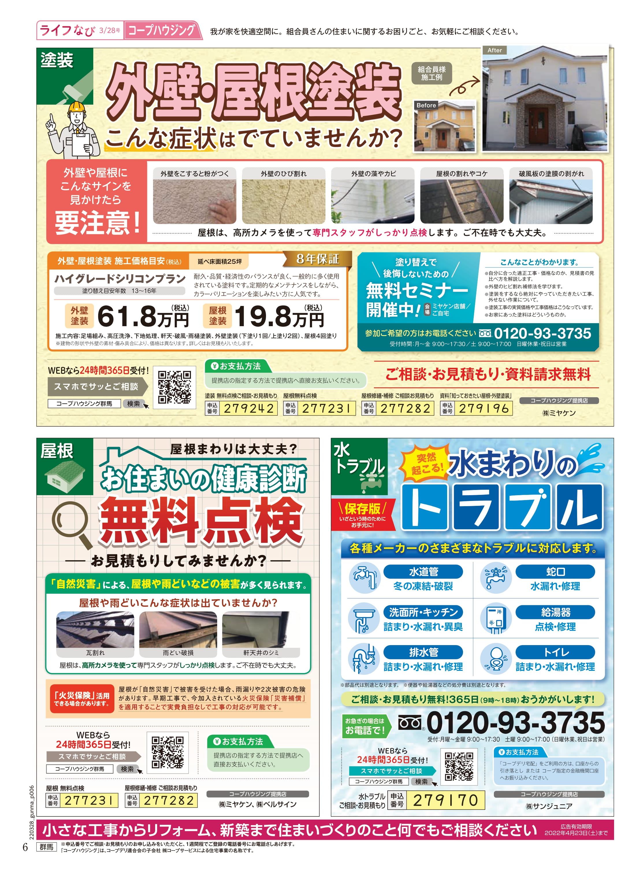 HOME毎月発行チラシ『ライフなび』群馬ライフなび 群馬 2022年3月28日号 ライフなび 群馬 2022年3月28日号 ライフなび 群馬 2022年3月28日号 毎月発行チラシ『ライフなび』一覧はこちら 施工事例 施工事例一覧 内装 外装 水回り 組合員の声 組合員の声一覧 カテゴリーなし お役立ち情報 暮らしに役立つ情報 リフォームメニュー表 毎月発行チラシ『ライフなび』 シロアリ防除について アフターフォロー お問い合わせ・お申し込みからお支払いまでの流れ よくある質問 お問い合わせ お問い合わせ 各エリアの情報はこちら 各エリア情報 東京 埼玉 千葉 茨城 群馬 長野 新潟 その他の情報はこちら チケット くらしのサービス 葬祭