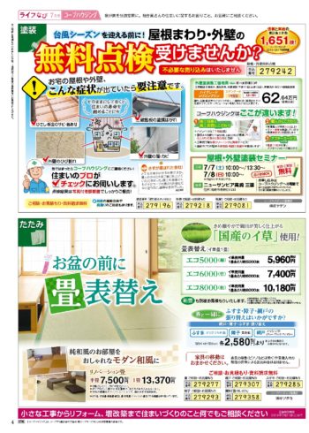 HOME毎月発行チラシ『ライフなび』群馬ライフなび 群馬 2018年7月号 ライフなび 群馬 2018年7月号 ライフなび 群馬 2018年7月号 毎月発行チラシ『ライフなび』一覧はこちら 施工事例 施工事例一覧 内装 外装 水回り 組合員の声 組合員の声一覧 カテゴリーなし お役立ち情報 暮らしに役立つ情報 リフォームメニュー表 毎月発行チラシ『ライフなび』 シロアリ防除について アフターフォロー お問い合わせ・お申し込みからお支払いまでの流れ よくある質問 お問い合わせ お問い合わせ 各エリアの情報はこちら 各エリア情報 東京 埼玉 千葉 茨城 群馬 長野 新潟 その他の情報はこちら チケット くらしのサービス 葬祭