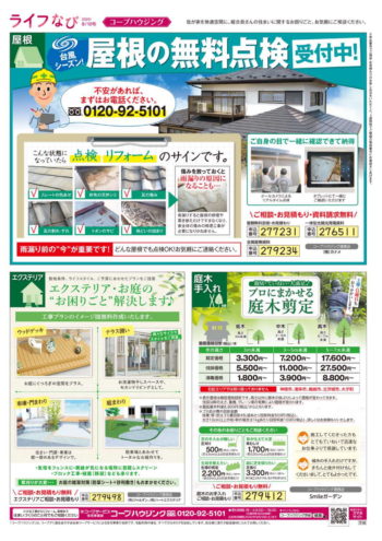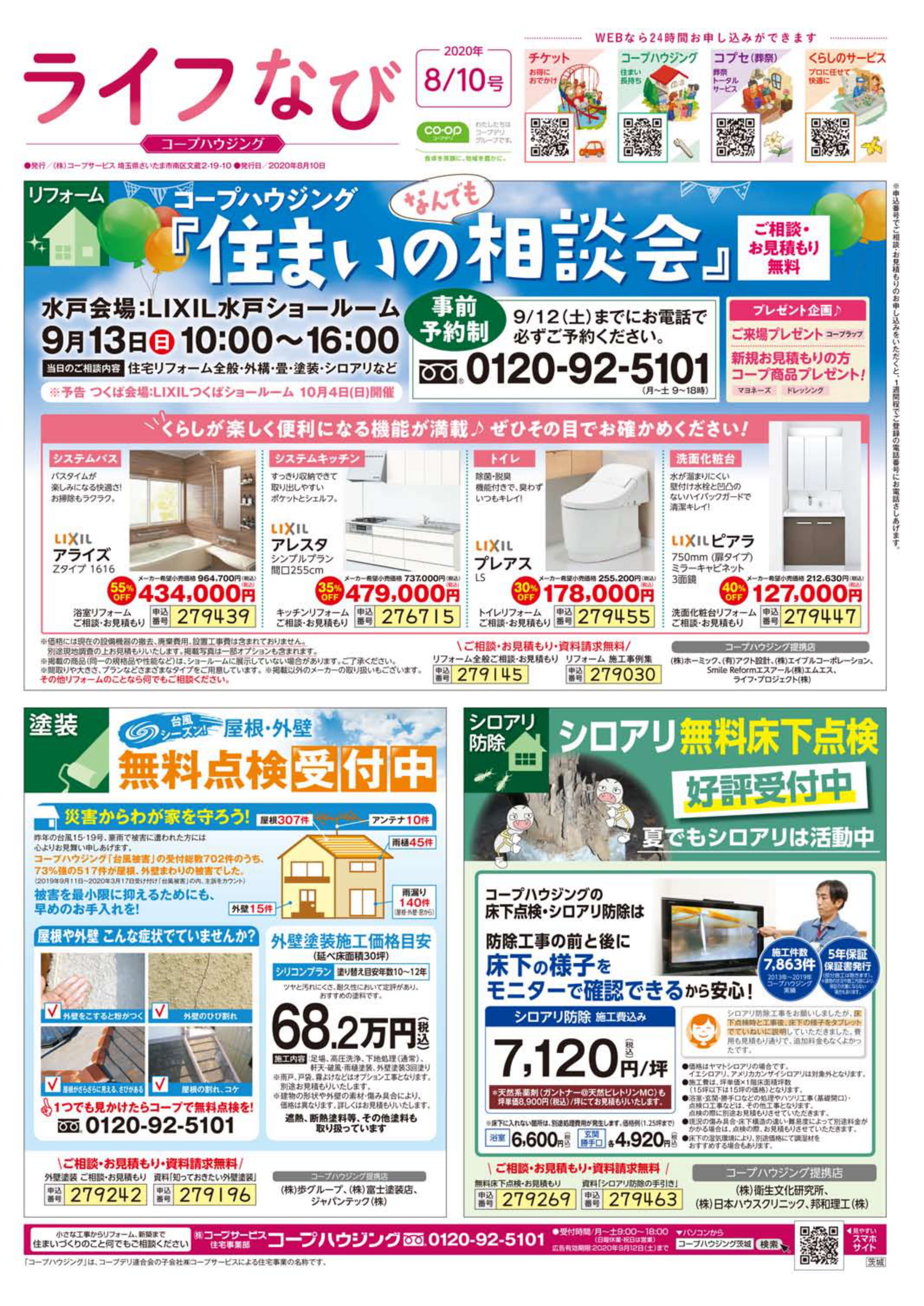 HOME毎月発行チラシ『ライフなび』茨城ライフなび 茨城 2020年8月10日号 ライフなび 茨城 2020年8月10日号 ライフなび 茨城 2020年8月10日号 毎月発行チラシ『ライフなび』一覧はこちら 施工事例 施工事例一覧 内装 外装 水回り 組合員の声 組合員の声一覧 カテゴリーなし お役立ち情報 暮らしに役立つ情報 リフォームメニュー表 毎月発行チラシ『ライフなび』 シロアリ防除について アフターフォロー お問い合わせ・お申し込みからお支払いまでの流れ よくある質問 お問い合わせ お問い合わせ 各エリアの情報はこちら 各エリア情報 東京 埼玉 千葉 茨城 群馬 長野 新潟 その他の情報はこちら チケット くらしのサービス 葬祭