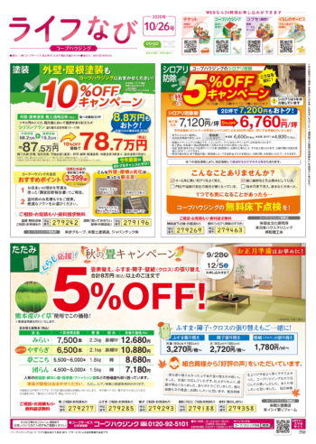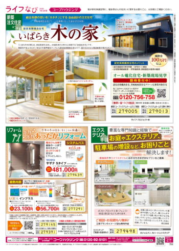 HOME毎月発行チラシ『ライフなび』茨城ライフなび 茨城 2020年10月26日号 ライフなび 茨城 2020年10月26日号 ライフなび 茨城 2020年10月26日号 毎月発行チラシ『ライフなび』一覧はこちら 施工事例 施工事例一覧 内装 外装 水回り 組合員の声 組合員の声一覧 カテゴリーなし お役立ち情報 暮らしに役立つ情報 リフォームメニュー表 毎月発行チラシ『ライフなび』 シロアリ防除について アフターフォロー お問い合わせ・お申し込みからお支払いまでの流れ よくある質問 お問い合わせ お問い合わせ 各エリアの情報はこちら 各エリア情報 東京 埼玉 千葉 茨城 群馬 長野 新潟 その他の情報はこちら チケット くらしのサービス 葬祭