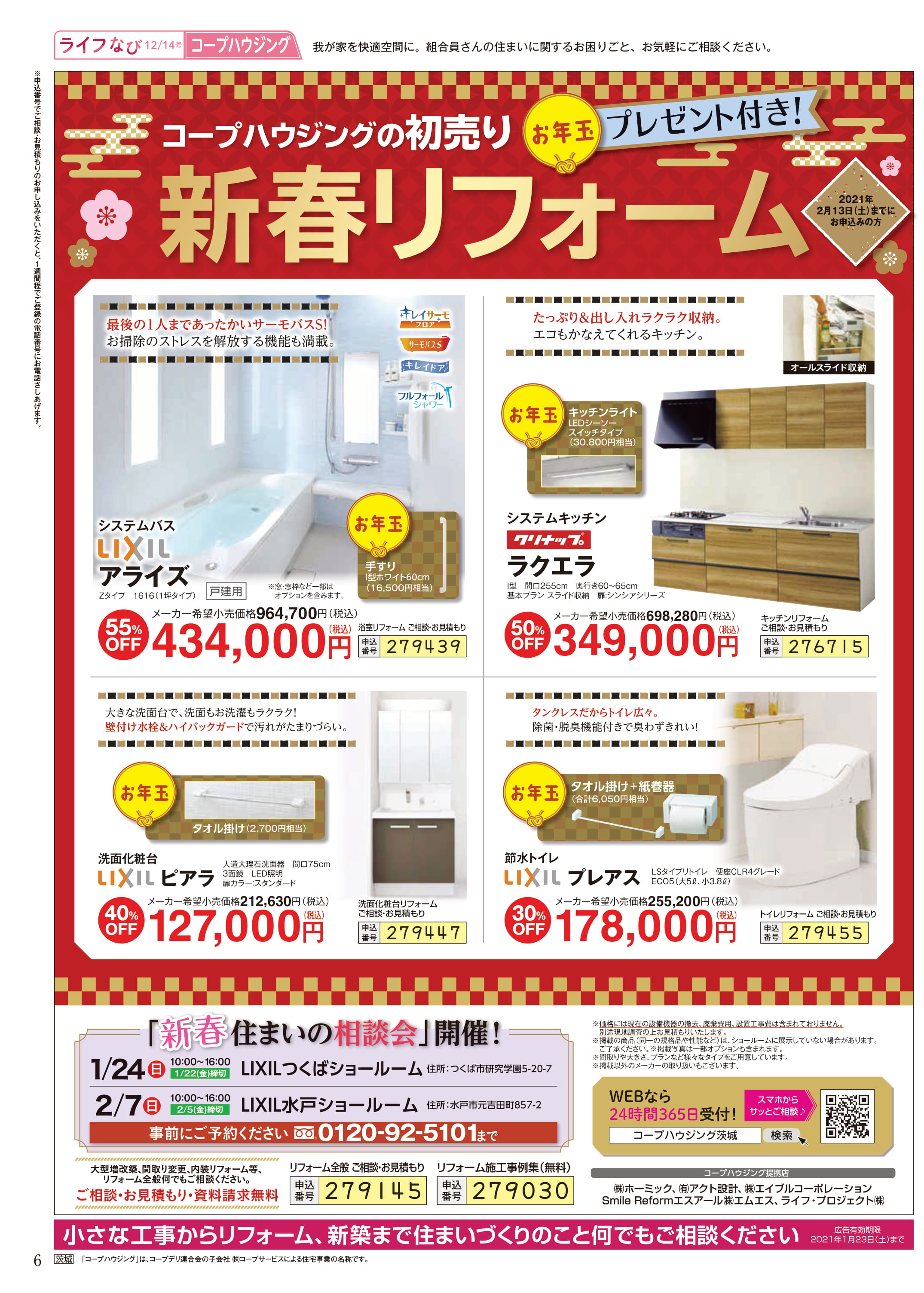 HOME毎月発行チラシ『ライフなび』茨城ライフなび 茨城 2020年12月14日号 ライフなび 茨城 2020年12月14日号 ライフなび 茨城 2020年12月14日号 毎月発行チラシ『ライフなび』一覧はこちら 施工事例 施工事例一覧 内装 外装 水回り 組合員の声 組合員の声一覧 カテゴリーなし お役立ち情報 暮らしに役立つ情報 リフォームメニュー表 毎月発行チラシ『ライフなび』 シロアリ防除について アフターフォロー お問い合わせ・お申し込みからお支払いまでの流れ よくある質問 お問い合わせ お問い合わせ 各エリアの情報はこちら 各エリア情報 東京 埼玉 千葉 茨城 群馬 長野 新潟 その他の情報はこちら チケット くらしのサービス 葬祭