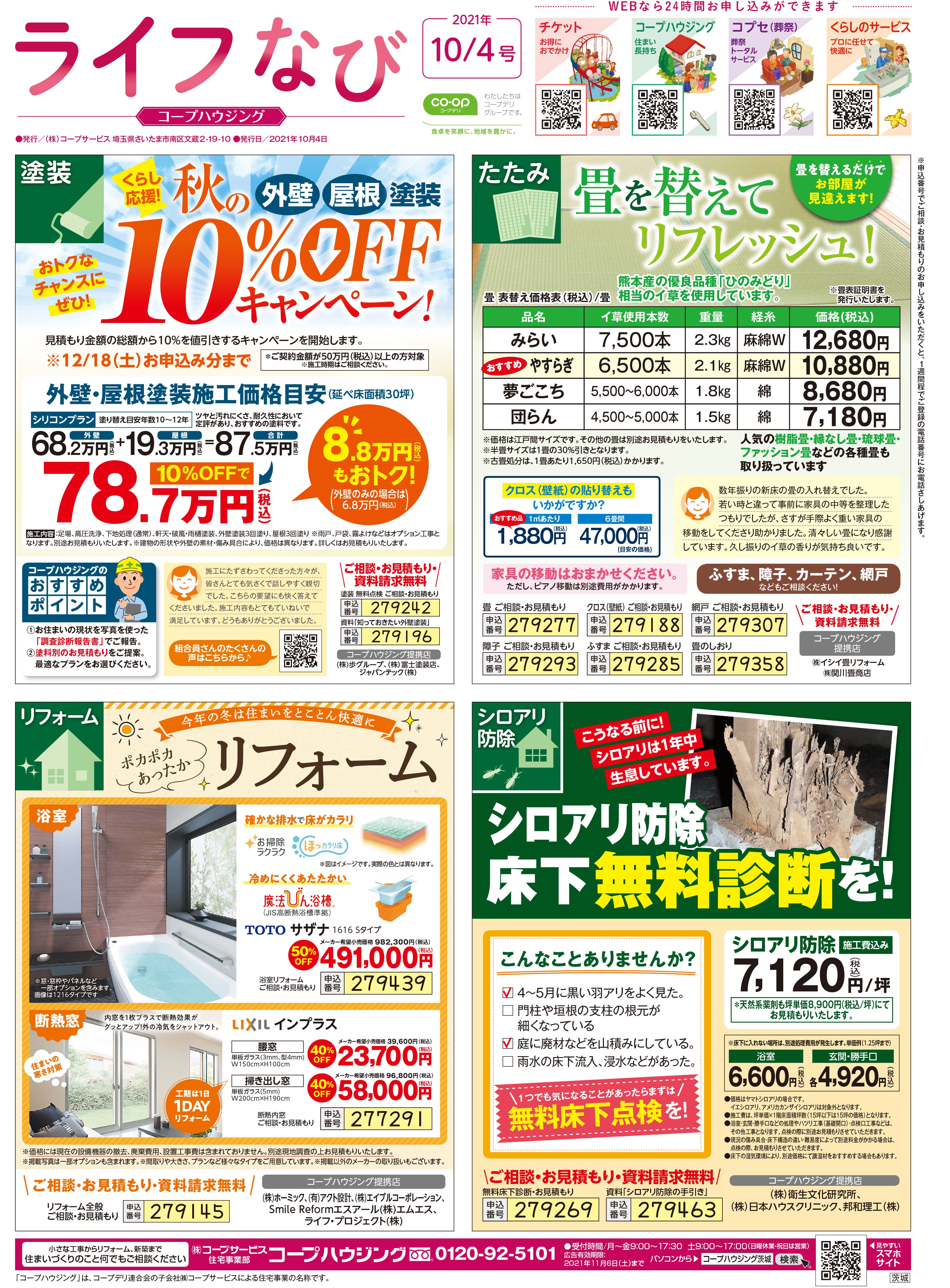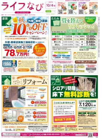 HOME毎月発行チラシ『ライフなび』茨城ライフなび 茨城 2021年10月4日号 ライフなび 茨城 2021年10月4日号 ライフなび 茨城 2021年10月4日号 毎月発行チラシ『ライフなび』一覧はこちら 施工事例 施工事例一覧 内装 外装 水回り 組合員の声 組合員の声一覧 カテゴリーなし お役立ち情報 暮らしに役立つ情報 リフォームメニュー表 毎月発行チラシ『ライフなび』 シロアリ防除について アフターフォロー お問い合わせ・お申し込みからお支払いまでの流れ よくある質問 お問い合わせ お問い合わせ 各エリアの情報はこちら 各エリア情報 東京 埼玉 千葉 茨城 群馬 長野 新潟 その他の情報はこちら チケット くらしのサービス 葬祭