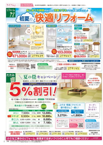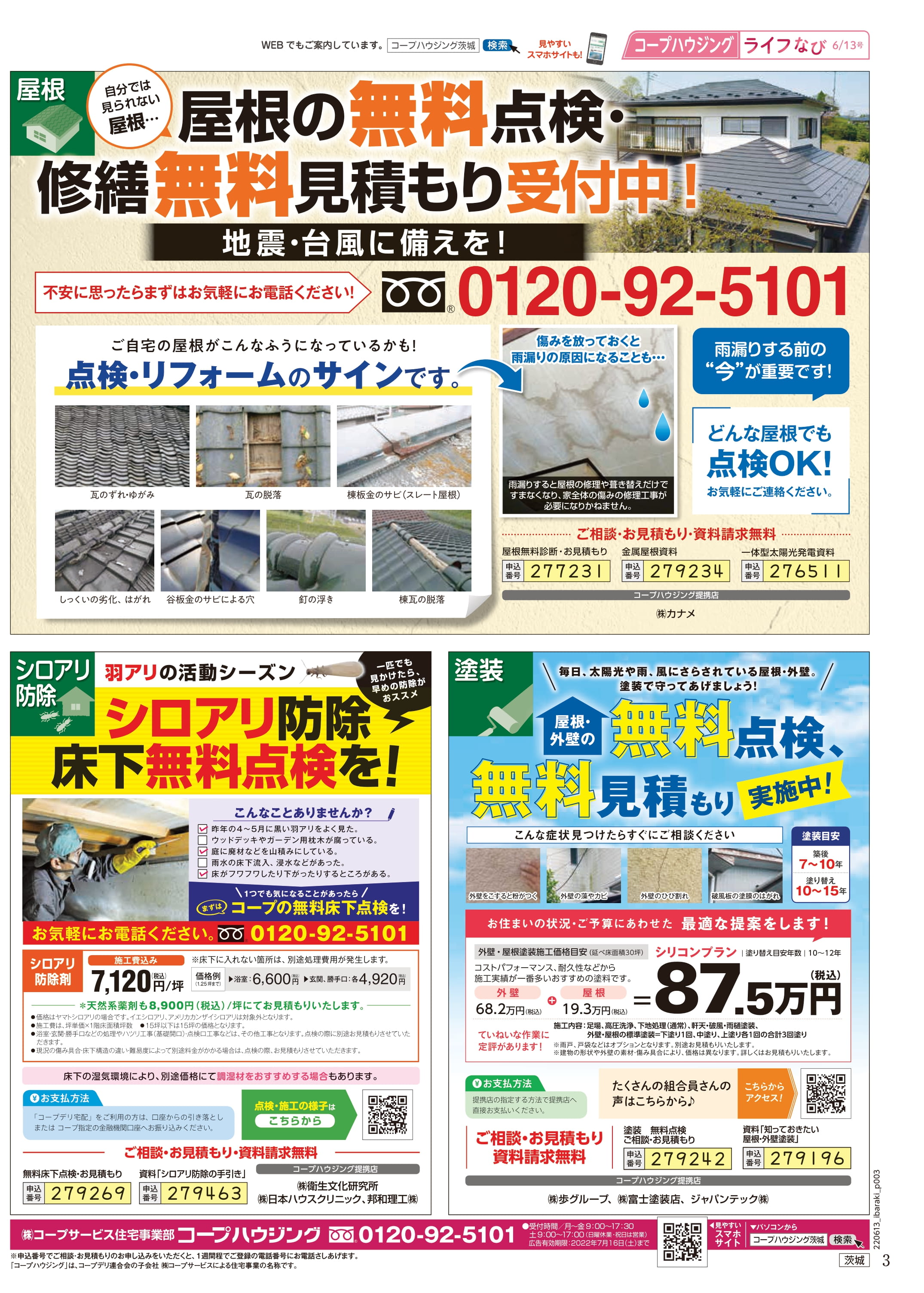 HOME毎月発行チラシ『ライフなび』茨城ライフなび 茨城 2022年6月13日号 ライフなび 茨城 2022年6月13日号 ライフなび 茨城 2022年6月13日号 毎月発行チラシ『ライフなび』一覧はこちら 施工事例 施工事例一覧 内装 外装 水回り 組合員の声 組合員の声一覧 カテゴリーなし お役立ち情報 暮らしに役立つ情報 リフォームメニュー表 毎月発行チラシ『ライフなび』 シロアリ防除について アフターフォロー お問い合わせ・お申し込みからお支払いまでの流れ よくある質問 お問い合わせ お問い合わせ 各エリアの情報はこちら 各エリア情報 東京 埼玉 千葉 茨城 群馬 長野 新潟 その他の情報はこちら チケット くらしのサービス 葬祭