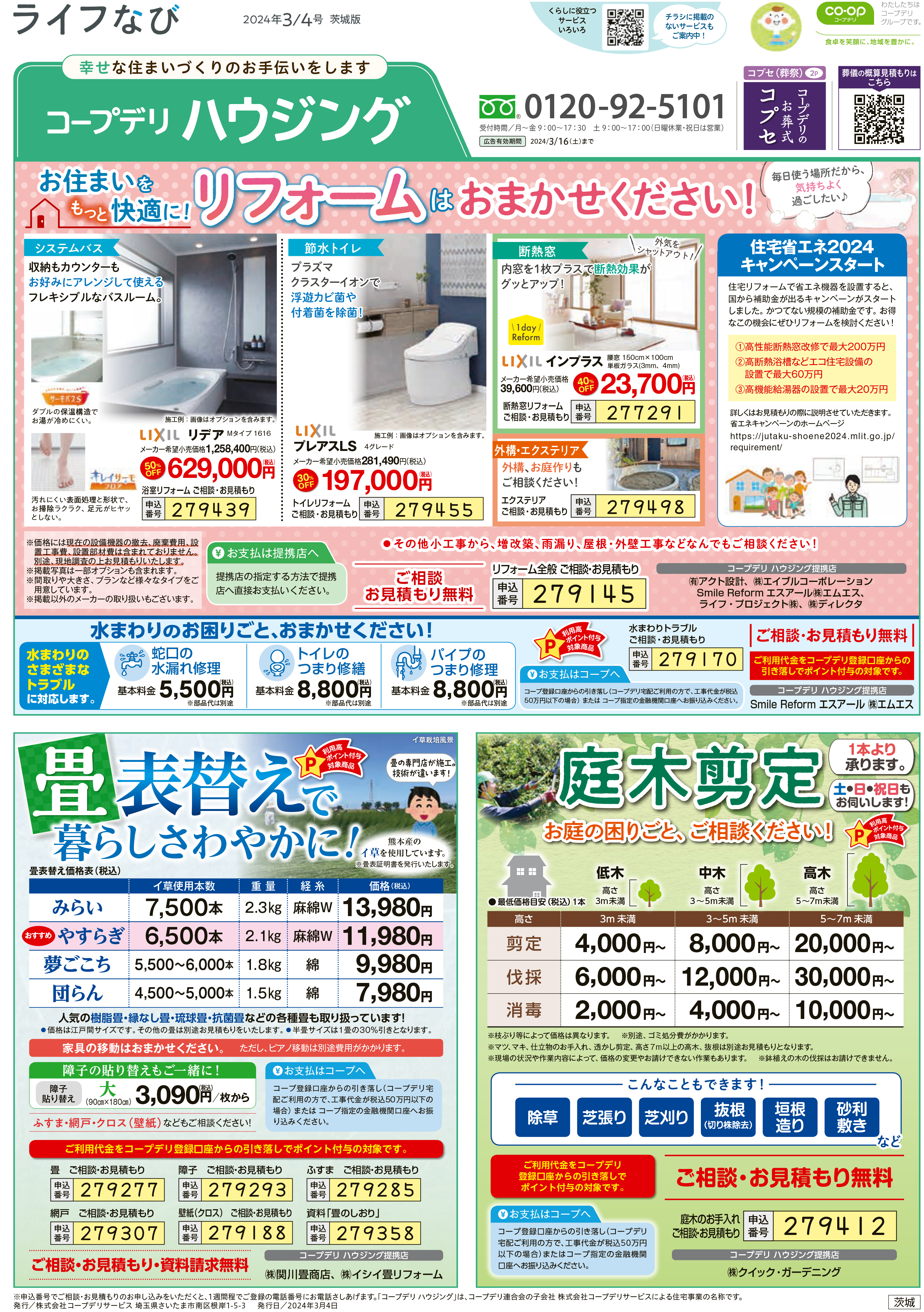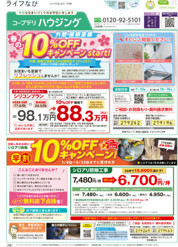 HOME毎月発行チラシ『ライフなび』茨城ライフなび 茨城 2024年3月4日号 ライフなび 茨城 2024年3月4日号 ライフなび 茨城 2024年3月4日号 毎月発行チラシ『ライフなび』一覧はこちら 施工事例 施工事例一覧 内装 外装 水回り 組合員の声 組合員の声一覧 カテゴリーなし お役立ち情報 暮らしに役立つ情報 リフォームメニュー表 毎月発行チラシ『ライフなび』 シロアリ防除について アフターフォロー お問い合わせ・お申し込みからお支払いまでの流れ よくある質問 お問い合わせ お問い合わせ 各エリアの情報はこちら 各エリア情報 東京 埼玉 千葉 茨城 群馬 長野 新潟 その他の情報はこちら チケット くらしのサービス 葬祭