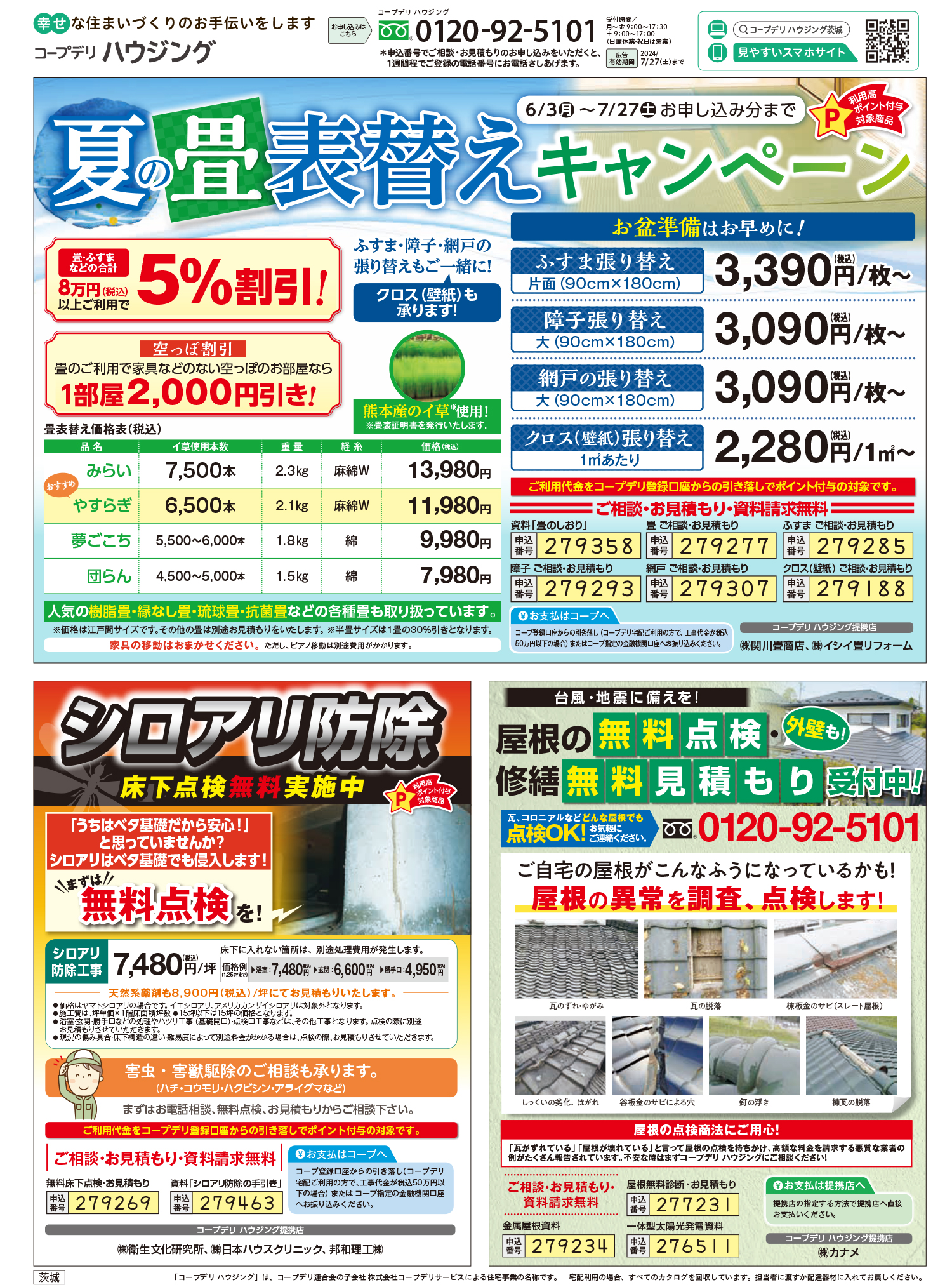 HOME毎月発行チラシ『ライフなび』茨城ライフなび 茨城 2024年7月1日号 ライフなび 茨城 2024年7月1日号 ライフなび 茨城 2024年7月1日号 毎月発行チラシ『ライフなび』一覧はこちら 施工事例 施工事例一覧 内装 外装 水回り 組合員の声 組合員の声一覧 カテゴリーなし お役立ち情報 暮らしに役立つ情報 リフォームメニュー表 毎月発行チラシ『ライフなび』 シロアリ防除について アフターフォロー お問い合わせ・お申し込みからお支払いまでの流れ よくある質問 お問い合わせ お問い合わせ 各エリアの情報はこちら 各エリア情報 東京 埼玉 千葉 茨城 群馬 長野 新潟 その他の情報はこちら チケット くらしのサービス 葬祭