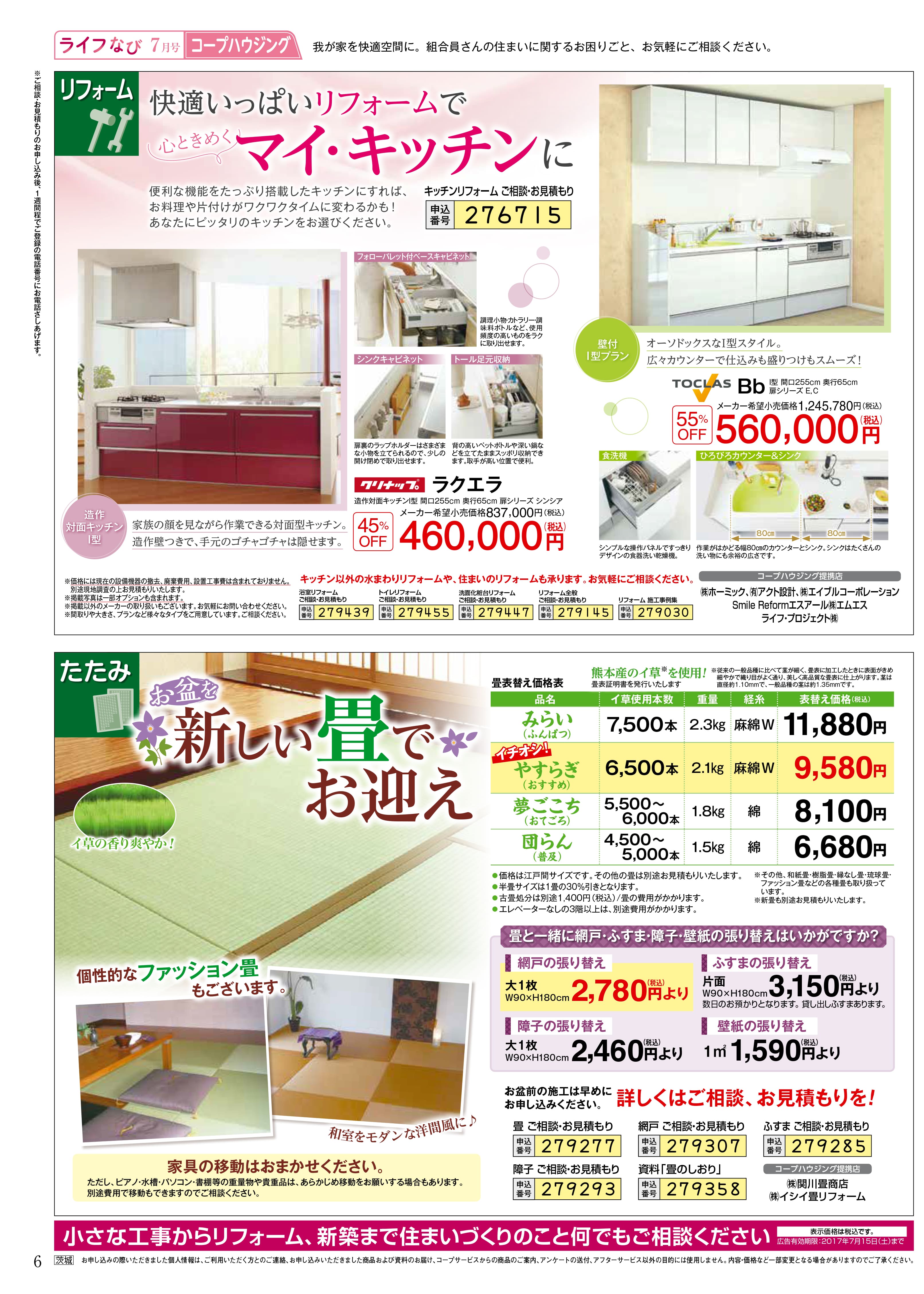 HOME毎月発行チラシ『ライフなび』茨城ライフなび 茨城 7月号 ライフなび 茨城 7月号 ライフなび 茨城 7月号 毎月発行チラシ『ライフなび』一覧はこちら 施工事例 施工事例一覧 内装 外装 水回り 組合員の声 組合員の声一覧 カテゴリーなし お役立ち情報 暮らしに役立つ情報 リフォームメニュー表 毎月発行チラシ『ライフなび』 シロアリ防除について アフターフォロー お問い合わせ・お申し込みからお支払いまでの流れ よくある質問 お問い合わせ お問い合わせ 各エリアの情報はこちら 各エリア情報 東京 埼玉 千葉 茨城 群馬 長野 新潟 その他の情報はこちら チケット くらしのサービス 葬祭