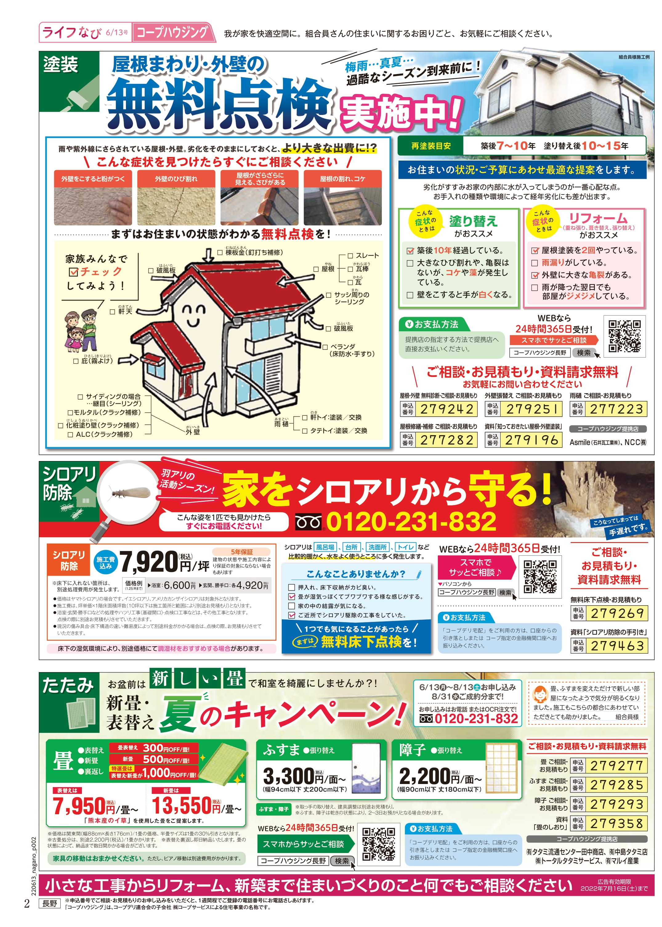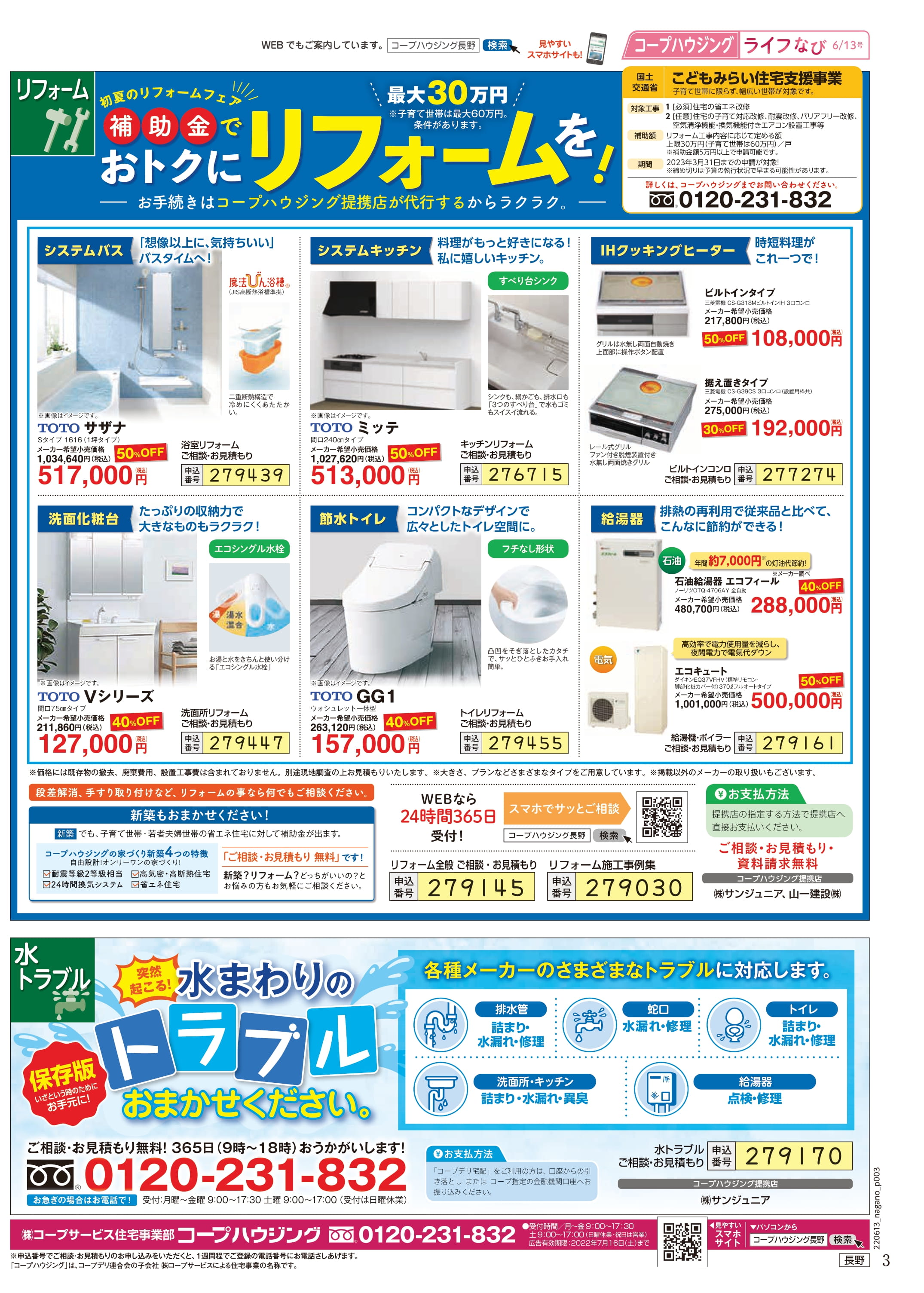 HOME毎月発行チラシ『ライフなび』長野ライフなび 長野 2022年6月13日号 ライフなび 長野 2022年6月13日号 ライフなび 長野 2022年6月13日号 毎月発行チラシ『ライフなび』一覧はこちら 施工事例 施工事例一覧 内装 外装 水回り 組合員の声 組合員の声一覧 カテゴリーなし お役立ち情報 暮らしに役立つ情報 リフォームメニュー表 毎月発行チラシ『ライフなび』 シロアリ防除について アフターフォロー お問い合わせ・お申し込みからお支払いまでの流れ よくある質問 お問い合わせ お問い合わせ 各エリアの情報はこちら 各エリア情報 東京 埼玉 千葉 茨城 群馬 長野 新潟 その他の情報はこちら チケット くらしのサービス 葬祭