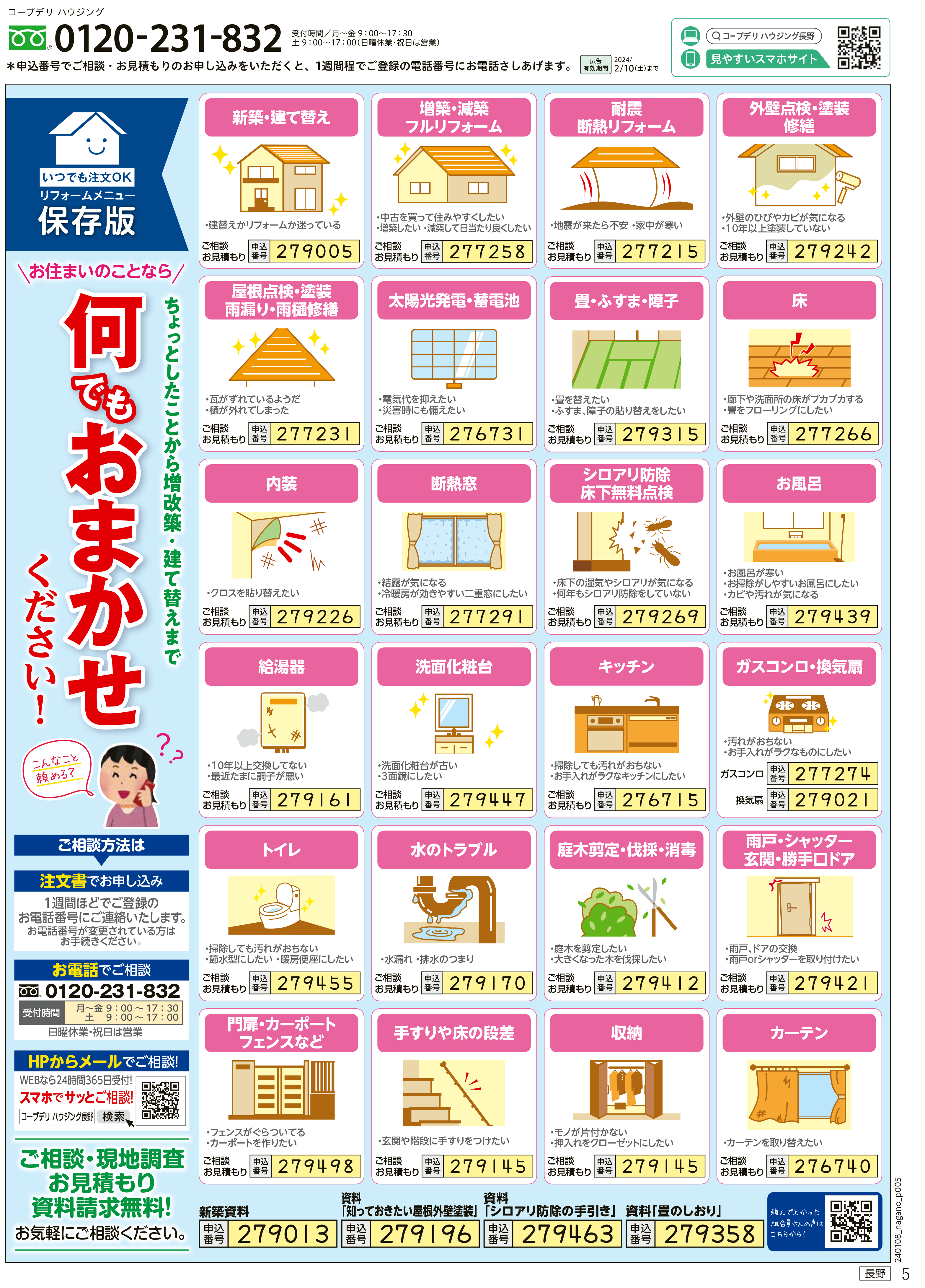 HOME毎月発行チラシ『ライフなび』長野ライフなび 長野 2024年1月8日号 ライフなび 長野 2024年1月8日号 ライフなび 長野 2024年1月8日号 毎月発行チラシ『ライフなび』一覧はこちら 施工事例 施工事例一覧 内装 外装 水回り 組合員の声 組合員の声一覧 カテゴリーなし お役立ち情報 暮らしに役立つ情報 リフォームメニュー表 毎月発行チラシ『ライフなび』 シロアリ防除について アフターフォロー お問い合わせ・お申し込みからお支払いまでの流れ よくある質問 お問い合わせ お問い合わせ 各エリアの情報はこちら 各エリア情報 東京 埼玉 千葉 茨城 群馬 長野 新潟 その他の情報はこちら チケット くらしのサービス 葬祭