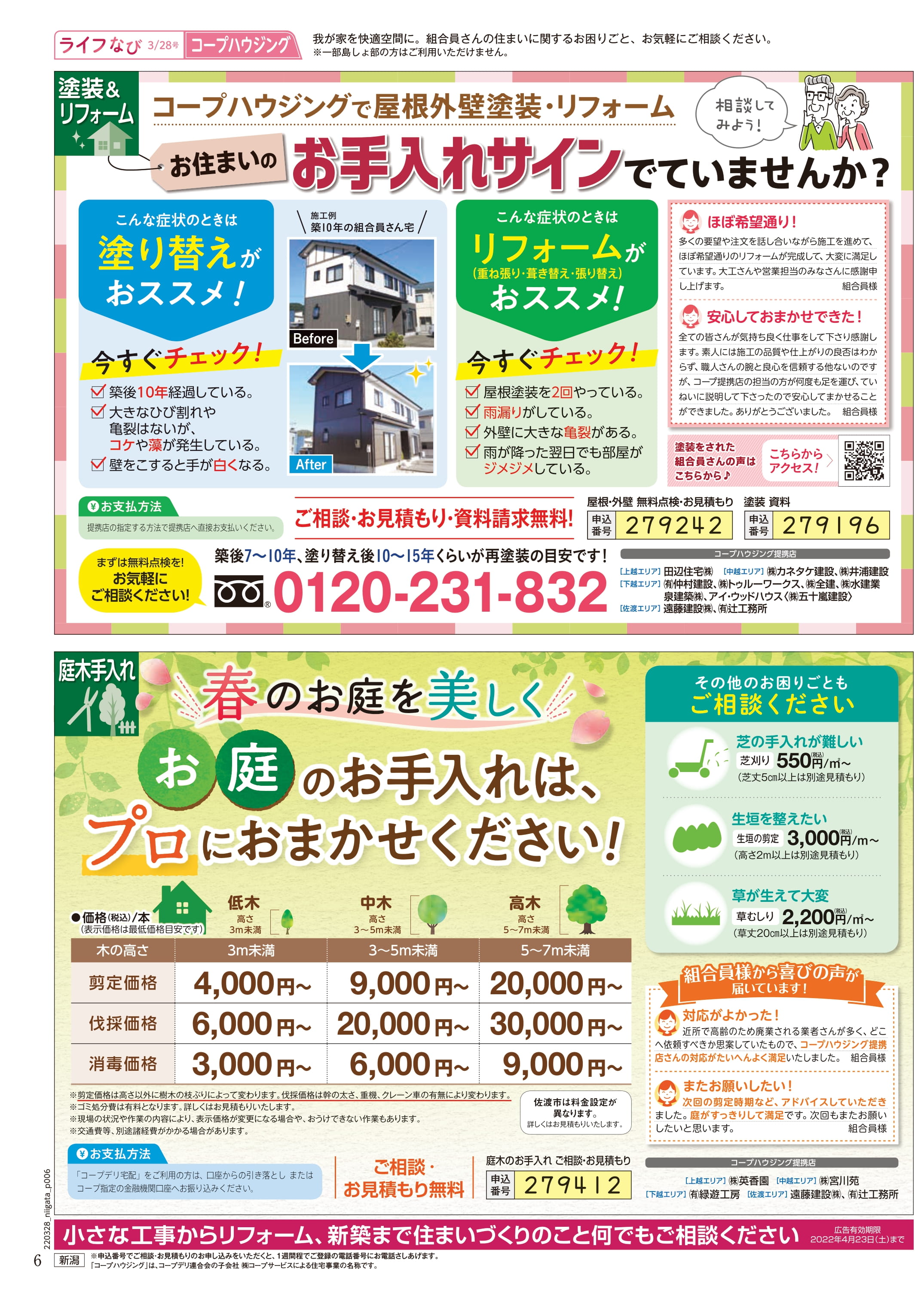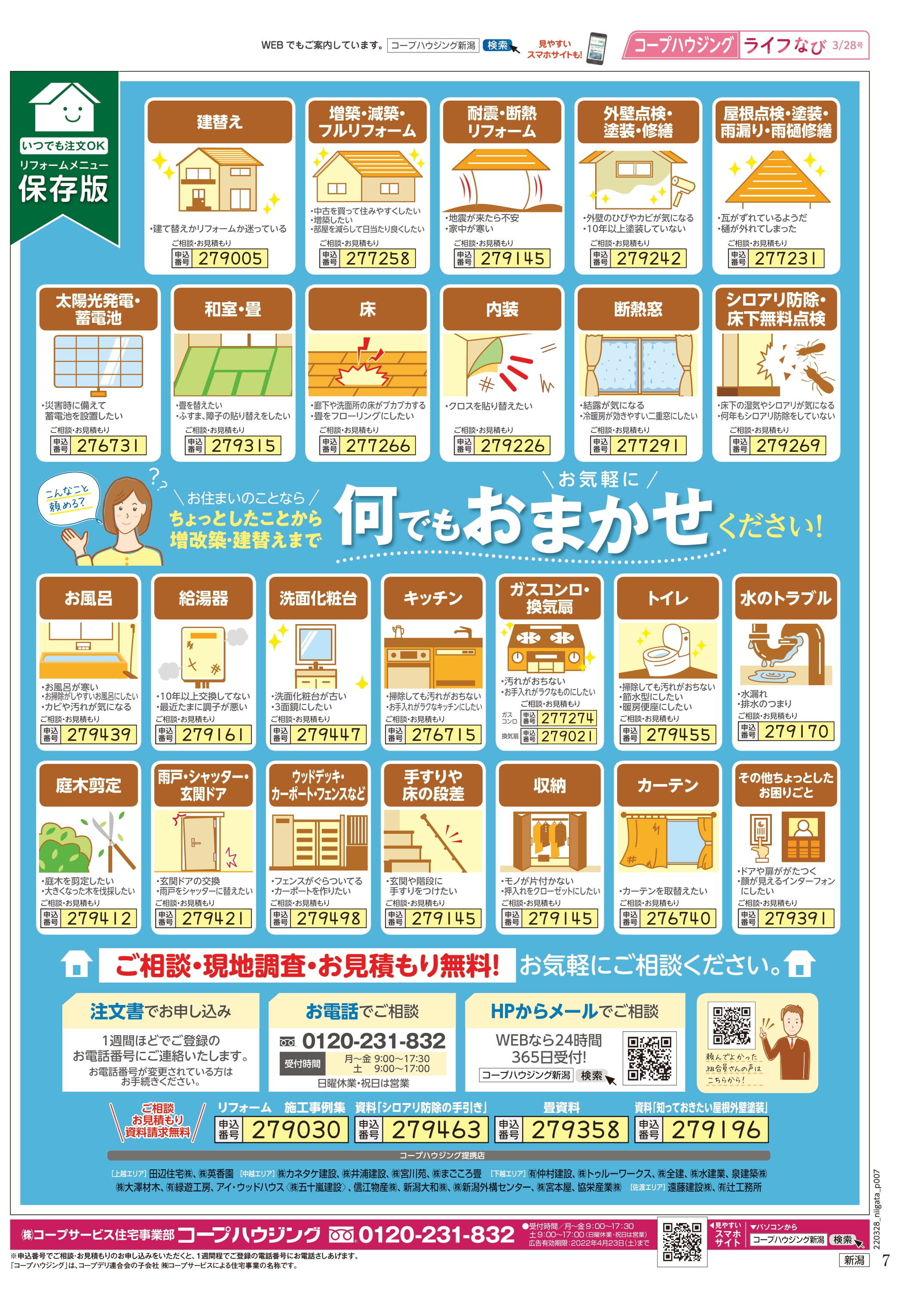 HOME毎月発行チラシ『ライフなび』新潟ライフなび 新潟 2022年3月28日号 ライフなび 新潟 2022年3月28日号 ライフなび 新潟 2022年3月28日号 毎月発行チラシ『ライフなび』一覧はこちら 施工事例 施工事例一覧 内装 外装 水回り 組合員の声 組合員の声一覧 カテゴリーなし お役立ち情報 暮らしに役立つ情報 リフォームメニュー表 毎月発行チラシ『ライフなび』 シロアリ防除について アフターフォロー お問い合わせ・お申し込みからお支払いまでの流れ よくある質問 お問い合わせ お問い合わせ 各エリアの情報はこちら 各エリア情報 東京 埼玉 千葉 茨城 群馬 長野 新潟 その他の情報はこちら チケット くらしのサービス 葬祭