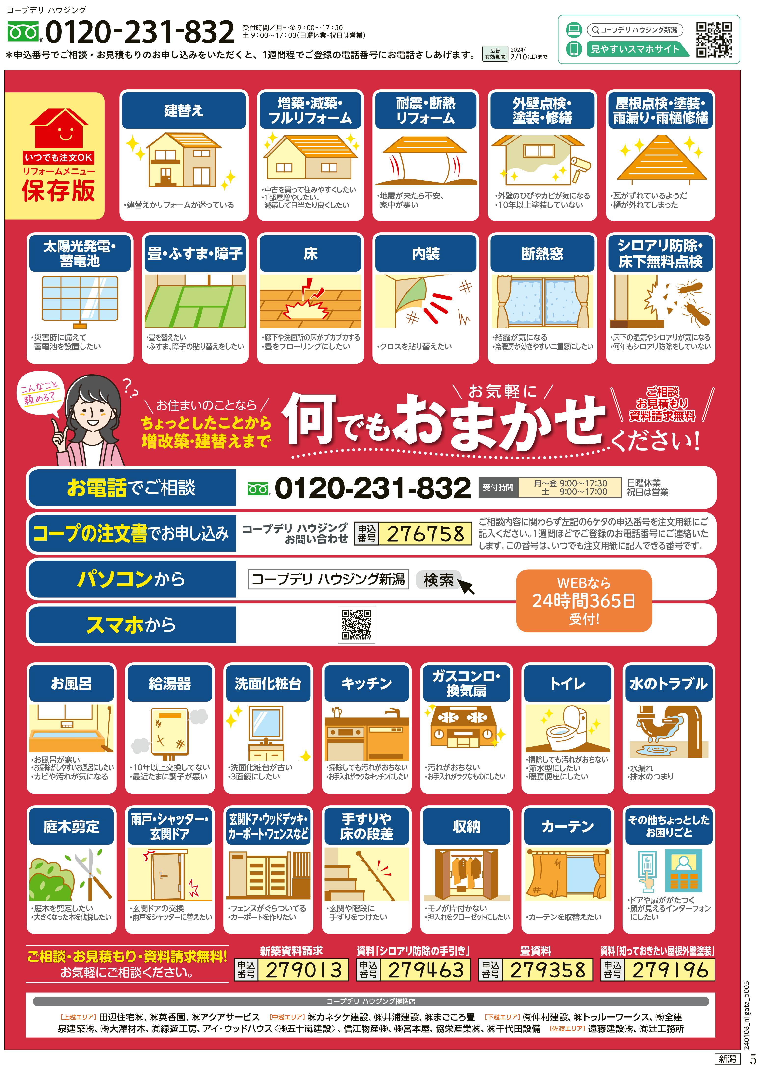 HOME毎月発行チラシ『ライフなび』新潟ライフなび 新潟 2024年1月8日号 ライフなび 新潟 2024年1月8日号 ライフなび 新潟 2024年1月8日号 毎月発行チラシ『ライフなび』一覧はこちら 施工事例 施工事例一覧 内装 外装 水回り 組合員の声 組合員の声一覧 カテゴリーなし お役立ち情報 暮らしに役立つ情報 リフォームメニュー表 毎月発行チラシ『ライフなび』 シロアリ防除について アフターフォロー お問い合わせ・お申し込みからお支払いまでの流れ よくある質問 お問い合わせ お問い合わせ 各エリアの情報はこちら 各エリア情報 東京 埼玉 千葉 茨城 群馬 長野 新潟 その他の情報はこちら チケット くらしのサービス 葬祭