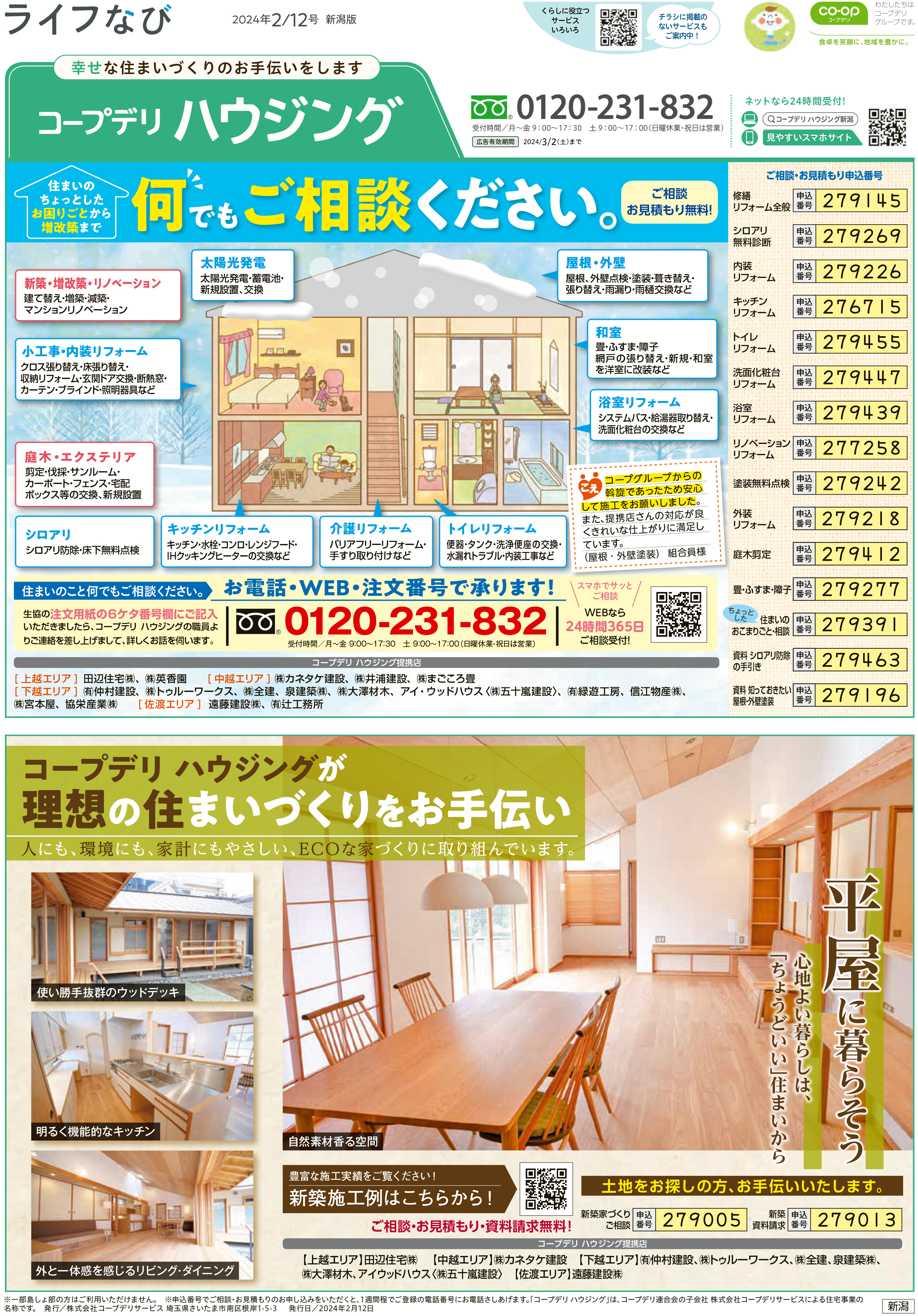 HOME毎月発行チラシ『ライフなび』新潟ライフなび 新潟 2024年2月12日号 ライフなび 新潟 2024年2月12日号 ライフなび 新潟 2024年2月12日号 毎月発行チラシ『ライフなび』一覧はこちら 施工事例 施工事例一覧 内装 外装 水回り 組合員の声 組合員の声一覧 カテゴリーなし お役立ち情報 暮らしに役立つ情報 リフォームメニュー表 毎月発行チラシ『ライフなび』 シロアリ防除について アフターフォロー お問い合わせ・お申し込みからお支払いまでの流れ よくある質問 お問い合わせ お問い合わせ 各エリアの情報はこちら 各エリア情報 東京 埼玉 千葉 茨城 群馬 長野 新潟 その他の情報はこちら チケット くらしのサービス 葬祭