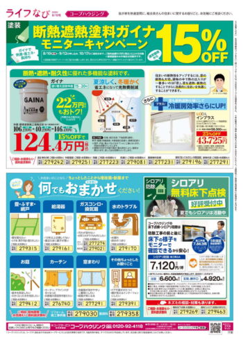HOME毎月発行チラシ『ライフなび』千葉ライフなび 千葉 2020年8月10日号 ライフなび 千葉 2020年8月10日号 ライフなび 千葉 2020年8月10日号 毎月発行チラシ『ライフなび』一覧はこちら 施工事例 施工事例一覧 内装 外装 水回り 組合員の声 組合員の声一覧 カテゴリーなし お役立ち情報 暮らしに役立つ情報 リフォームメニュー表 毎月発行チラシ『ライフなび』 シロアリ防除について アフターフォロー お問い合わせ・お申し込みからお支払いまでの流れ よくある質問 お問い合わせ お問い合わせ 各エリアの情報はこちら 各エリア情報 東京 埼玉 千葉 茨城 群馬 長野 新潟 その他の情報はこちら チケット くらしのサービス 葬祭