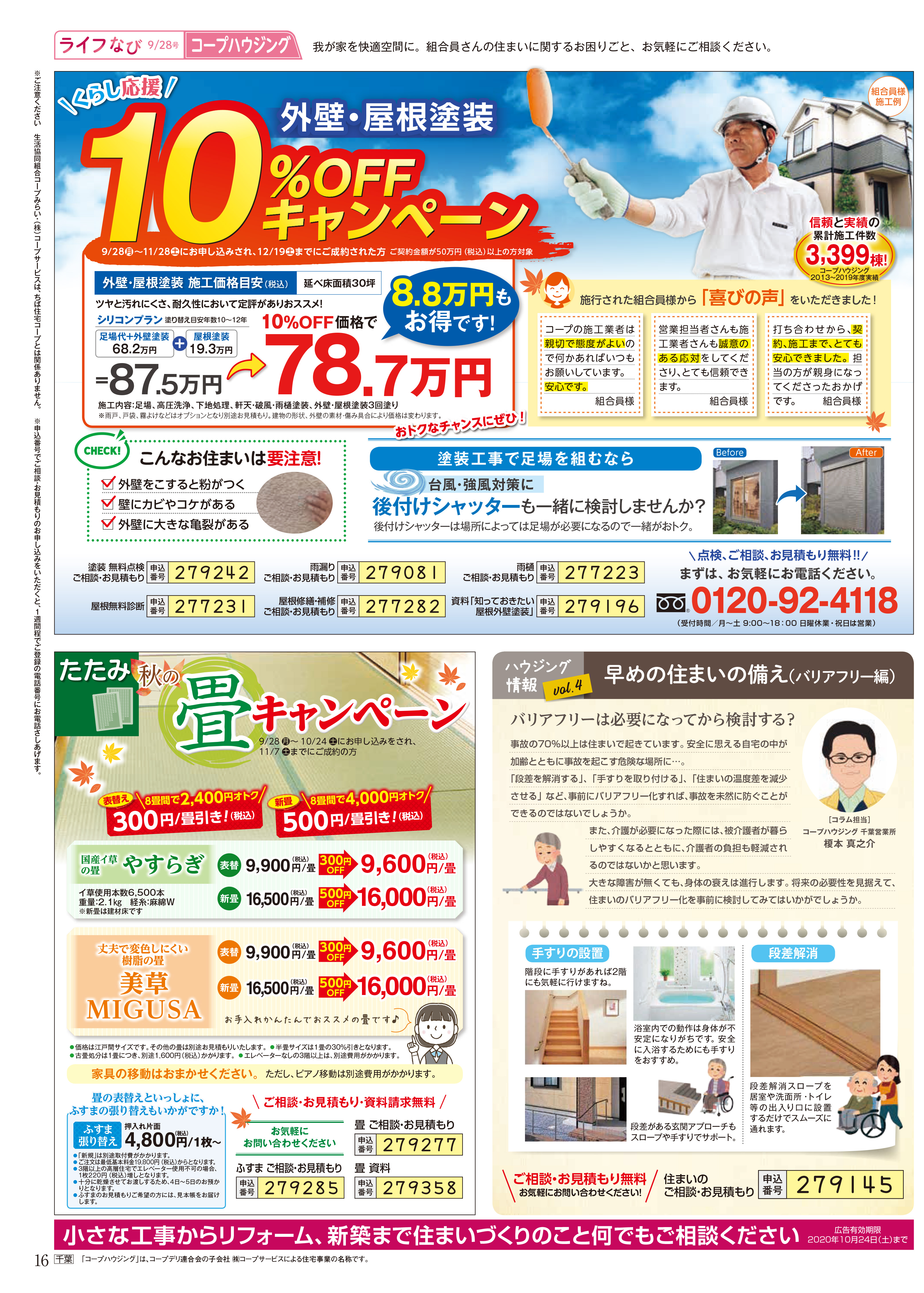 HOME毎月発行チラシ『ライフなび』千葉ライフなび 千葉 2020年9月28日号 ライフなび 千葉 2020年9月28日号 ライフなび 千葉 2020年9月28日号 毎月発行チラシ『ライフなび』一覧はこちら 施工事例 施工事例一覧 内装 外装 水回り 組合員の声 組合員の声一覧 カテゴリーなし お役立ち情報 暮らしに役立つ情報 リフォームメニュー表 毎月発行チラシ『ライフなび』 シロアリ防除について アフターフォロー お問い合わせ・お申し込みからお支払いまでの流れ よくある質問 お問い合わせ お問い合わせ 各エリアの情報はこちら 各エリア情報 東京 埼玉 千葉 茨城 群馬 長野 新潟 その他の情報はこちら チケット くらしのサービス 葬祭
