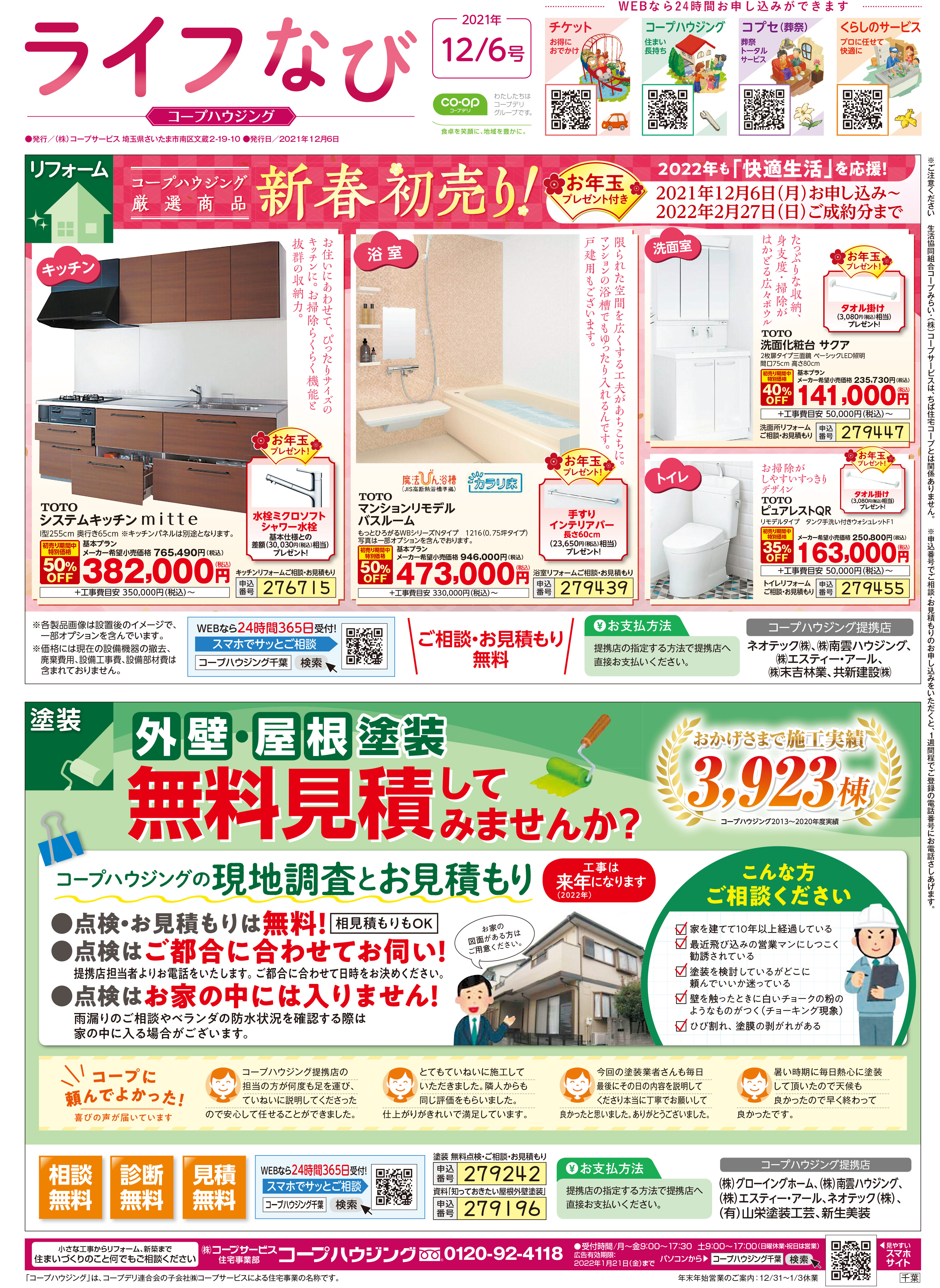 HOME毎月発行チラシ『ライフなび』千葉ライフなび 千葉 2021年12月6日号 ライフなび 千葉 2021年12月6日号 ライフなび 千葉 2021年12月6日号 毎月発行チラシ『ライフなび』一覧はこちら 施工事例 施工事例一覧 内装 外装 水回り 組合員の声 組合員の声一覧 カテゴリーなし お役立ち情報 暮らしに役立つ情報 リフォームメニュー表 毎月発行チラシ『ライフなび』 シロアリ防除について アフターフォロー お問い合わせ・お申し込みからお支払いまでの流れ よくある質問 お問い合わせ お問い合わせ 各エリアの情報はこちら 各エリア情報 東京 埼玉 千葉 茨城 群馬 長野 新潟 その他の情報はこちら チケット くらしのサービス 葬祭