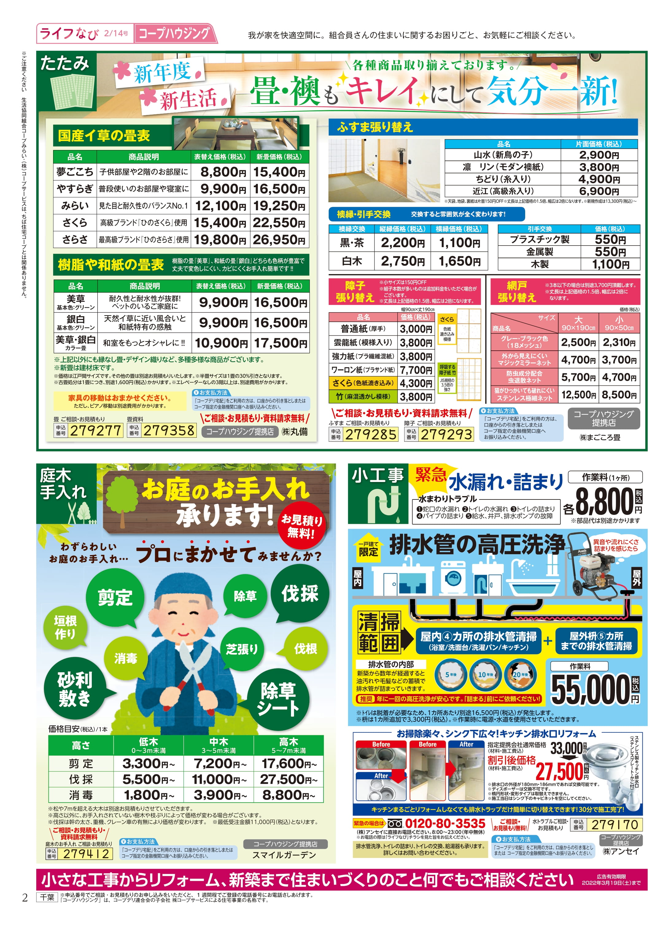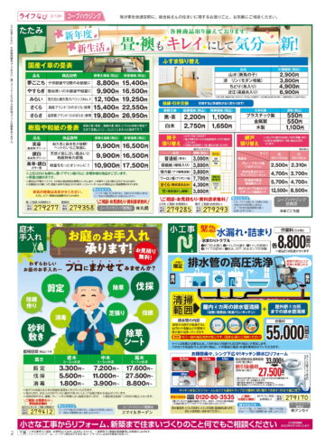 HOME毎月発行チラシ『ライフなび』千葉ライフなび 千葉 2022年2月14日号 ライフなび 千葉 2022年2月14日号 ライフなび 千葉 2022年2月14日号 毎月発行チラシ『ライフなび』一覧はこちら 施工事例 施工事例一覧 内装 外装 水回り 組合員の声 組合員の声一覧 カテゴリーなし お役立ち情報 暮らしに役立つ情報 リフォームメニュー表 毎月発行チラシ『ライフなび』 シロアリ防除について アフターフォロー お問い合わせ・お申し込みからお支払いまでの流れ よくある質問 お問い合わせ お問い合わせ 各エリアの情報はこちら 各エリア情報 東京 埼玉 千葉 茨城 群馬 長野 新潟 その他の情報はこちら チケット くらしのサービス 葬祭