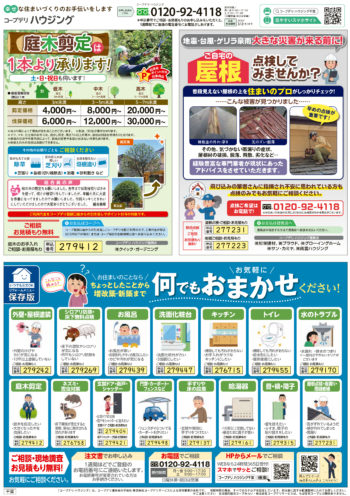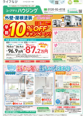 HOME毎月発行チラシ『ライフなび』千葉ライフなび 千葉 2024年2月12日号 ライフなび 千葉 2024年2月12日号 ライフなび 千葉 2024年2月12日号 毎月発行チラシ『ライフなび』一覧はこちら 施工事例 施工事例一覧 内装 外装 水回り 組合員の声 組合員の声一覧 カテゴリーなし お役立ち情報 暮らしに役立つ情報 リフォームメニュー表 毎月発行チラシ『ライフなび』 シロアリ防除について アフターフォロー お問い合わせ・お申し込みからお支払いまでの流れ よくある質問 お問い合わせ お問い合わせ 各エリアの情報はこちら 各エリア情報 東京 埼玉 千葉 茨城 群馬 長野 新潟 その他の情報はこちら チケット くらしのサービス 葬祭