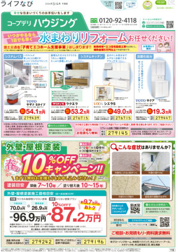 HOME毎月発行チラシ『ライフなび』千葉ライフなび 千葉 2024年3月4日号 ライフなび 千葉 2024年3月4日号 ライフなび 千葉 2024年3月4日号 毎月発行チラシ『ライフなび』一覧はこちら 施工事例 施工事例一覧 内装 外装 水回り 組合員の声 組合員の声一覧 カテゴリーなし お役立ち情報 暮らしに役立つ情報 リフォームメニュー表 毎月発行チラシ『ライフなび』 シロアリ防除について アフターフォロー お問い合わせ・お申し込みからお支払いまでの流れ よくある質問 お問い合わせ お問い合わせ 各エリアの情報はこちら 各エリア情報 東京 埼玉 千葉 茨城 群馬 長野 新潟 その他の情報はこちら チケット くらしのサービス 葬祭