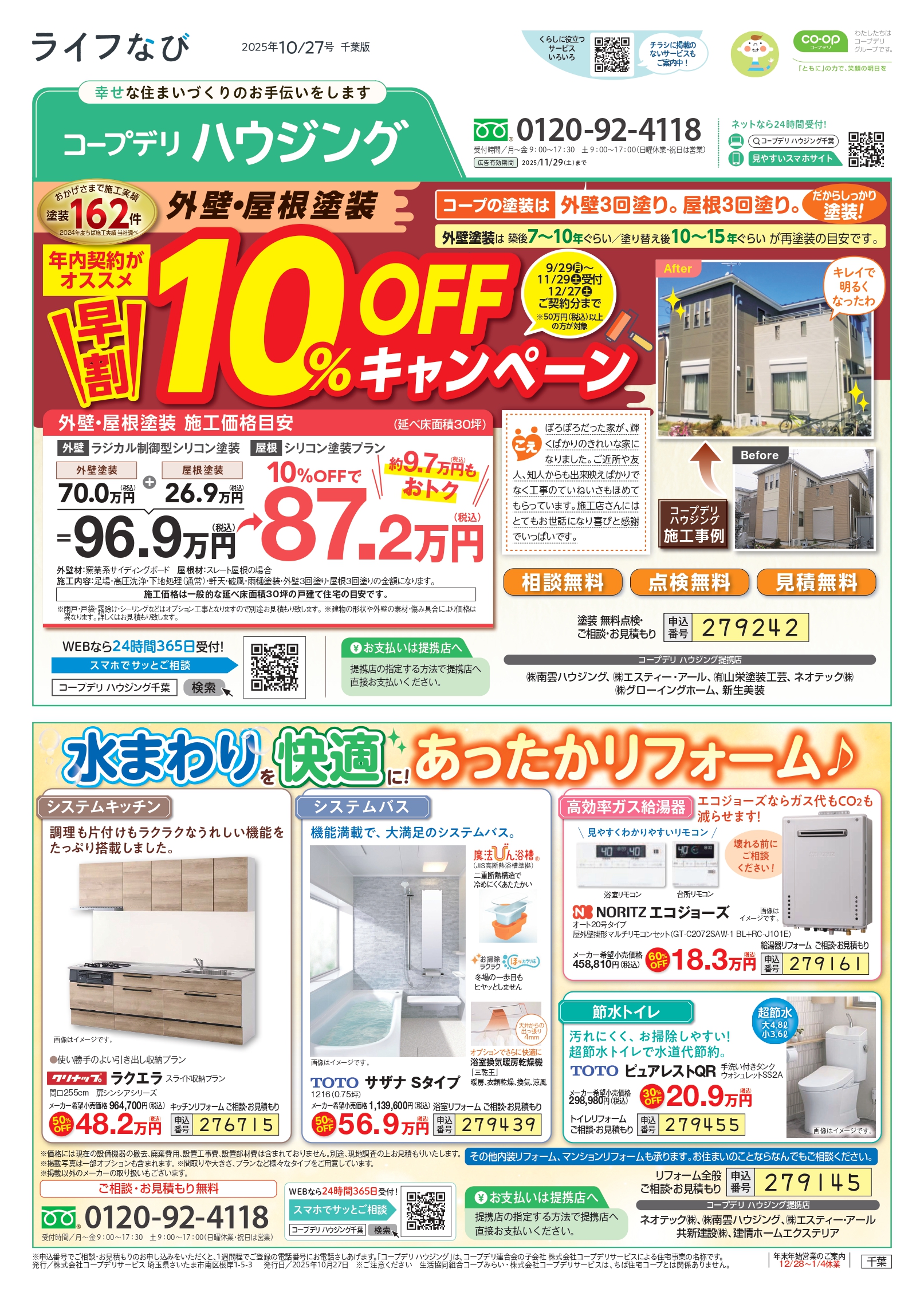 HOME毎月発行チラシ『ライフなび』千葉ライフなび 千葉 2025年10月27日号 ライフなび 千葉 2025年10月27日号 ライフなび 千葉 2025年10月27日号 毎月発行チラシ『ライフなび』一覧はこちら 施工事例 施工事例一覧 内装 外装 水回り 組合員の声 組合員の声一覧 カテゴリーなし お役立ち情報 暮らしに役立つ情報 リフォームメニュー表 毎月発行チラシ『ライフなび』 シロアリ防除について アフターフォロー お問い合わせ・お申し込みからお支払いまでの流れ よくある質問 お問い合わせ お問い合わせ 各エリアの情報はこちら 各エリア情報 東京 埼玉 千葉 茨城 群馬 長野 新潟 その他の情報はこちら チケット くらしのサービス 葬祭