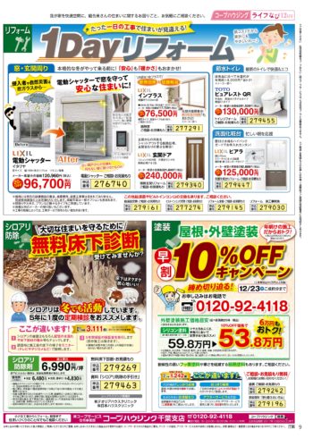 HOME毎月発行チラシ『ライフなび』千葉ライフなび 千葉 12月号 ライフなび 千葉 12月号 ライフなび 千葉 12月号 毎月発行チラシ『ライフなび』一覧はこちら 施工事例 施工事例一覧 内装 外装 水回り 組合員の声 組合員の声一覧 カテゴリーなし お役立ち情報 暮らしに役立つ情報 リフォームメニュー表 毎月発行チラシ『ライフなび』 シロアリ防除について アフターフォロー お問い合わせ・お申し込みからお支払いまでの流れ よくある質問 お問い合わせ お問い合わせ 各エリアの情報はこちら 各エリア情報 東京 埼玉 千葉 茨城 群馬 長野 新潟 その他の情報はこちら チケット くらしのサービス 葬祭