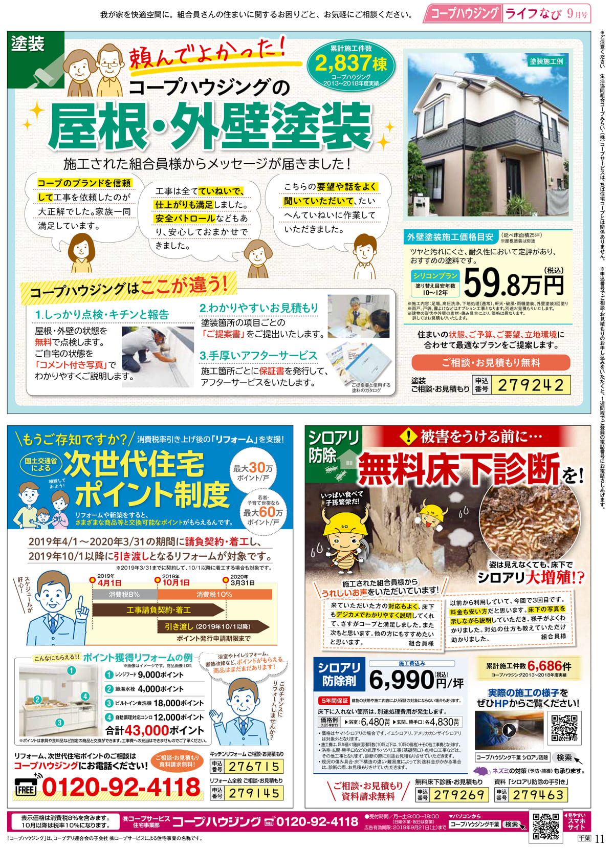 HOME毎月発行チラシ『ライフなび』千葉ライフなび 千葉 2019年9月号 ライフなび 千葉 2019年9月号 ライフなび 千葉 2019年9月号 毎月発行チラシ『ライフなび』一覧はこちら 施工事例 施工事例一覧 内装 外装 水回り 組合員の声 組合員の声一覧 カテゴリーなし お役立ち情報 暮らしに役立つ情報 リフォームメニュー表 毎月発行チラシ『ライフなび』 シロアリ防除について アフターフォロー お問い合わせ・お申し込みからお支払いまでの流れ よくある質問 お問い合わせ お問い合わせ 各エリアの情報はこちら 各エリア情報 東京 埼玉 千葉 茨城 群馬 長野 新潟 その他の情報はこちら チケット くらしのサービス 葬祭