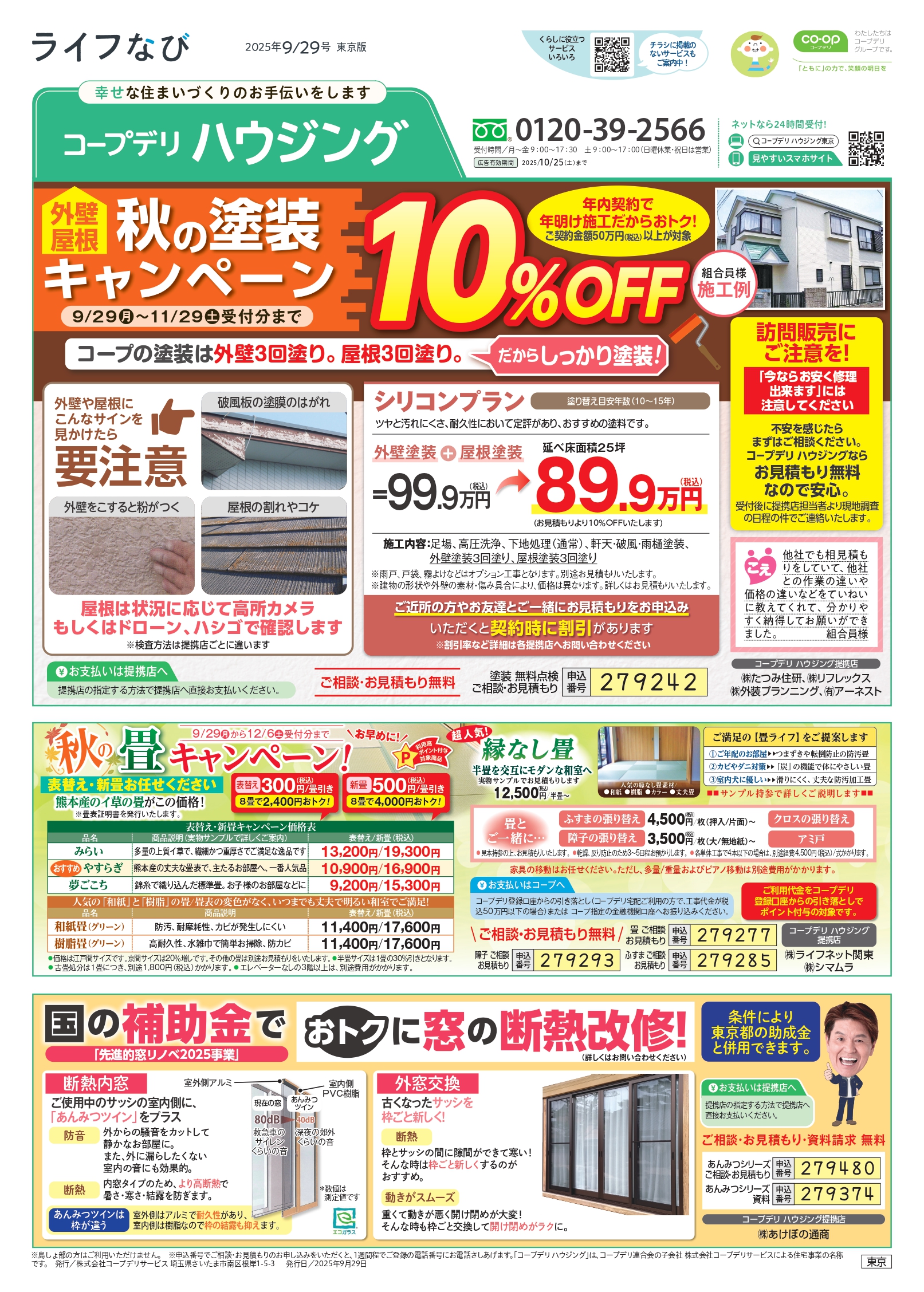 HOME毎月発行チラシ『ライフなび』東京ライフなび 東京 2025年9月29日号 ライフなび 東京 2025年9月29日号 ライフなび 東京 2025年9月29日号 毎月発行チラシ『ライフなび』一覧はこちら 施工事例 施工事例一覧 内装 外装 水回り 組合員の声 組合員の声一覧 カテゴリーなし お役立ち情報 暮らしに役立つ情報 リフォームメニュー表 毎月発行チラシ『ライフなび』 シロアリ防除について アフターフォロー お問い合わせ・お申し込みからお支払いまでの流れ よくある質問 お問い合わせ お問い合わせ 各エリアの情報はこちら 各エリア情報 東京 埼玉 千葉 茨城 群馬 長野 新潟 その他の情報はこちら チケット くらしのサービス 葬祭