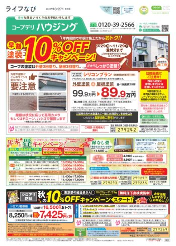 HOME毎月発行チラシ『ライフなび』東京ライフなび 東京 2025年10月27日号 ライフなび 東京 2025年10月27日号 ライフなび 東京 2025年10月27日号 毎月発行チラシ『ライフなび』一覧はこちら 施工事例 施工事例一覧 内装 外装 水回り 組合員の声 組合員の声一覧 カテゴリーなし お役立ち情報 暮らしに役立つ情報 リフォームメニュー表 毎月発行チラシ『ライフなび』 シロアリ防除について アフターフォロー お問い合わせ・お申し込みからお支払いまでの流れ よくある質問 お問い合わせ お問い合わせ 各エリアの情報はこちら 各エリア情報 東京 埼玉 千葉 茨城 群馬 長野 新潟 その他の情報はこちら チケット くらしのサービス 葬祭