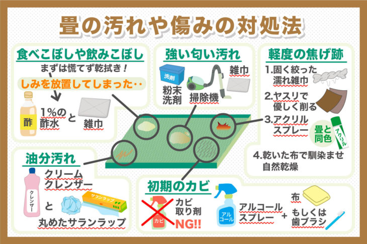 HOME畳のお手入れと張り替えの目安 畳のお手入れと張り替えの目安 畳にうっかり飲み物をこぼしてシミになってしまったり、カビがはえてしまったりしたことはありませんか?そんな時の対処法を知っておいて、畳の劣化を防ぎ、キレイを保ちましょう♪また、畳の汚れや傷みの対処法、張り替え時期について紹介しています! ●食べ物や飲み物をこぼしてしまったとき 食べ物や飲み物をこぼしてしまったら、まずは乾いた雑巾などでふき取りましょう。 ケチャップやソースなど、すぐにふき取ってもシミになってしまったら、小麦粉を振りかけて乾燥するまで待って、最後に掃除機で吸い取ってください。 シミに気づかず放置してしまった場合は、濃度1%の酢水を作って、雑巾を浸し固く絞って水拭きし、汚れをふき取りましょう。その後は忘れずに乾拭きしましょう。 ●クレヨンや口紅など油性の汚れがついてしまったとき クレヨンや口紅など油性の汚れは、サランラップを小さく丸めて、クリームクレンザーを少しつけ、力をいれずに押し付けないように汚れを優しくていねいに落とします。 畳目に汚れが入り込んでいる場合は、使い古しの歯ブラシに少量の中性洗剤をつけ目に沿って掻き出します。 汚れを取りきったら、固く絞った雑巾で水拭きをし、最後に乾拭きしましょう。 ●灯油や尿の汚れがついてしまったとき 灯油をこぼしたり、ペットや赤ちゃんの尿がついてしまうと、表面の汚れが取れても臭いが残りがち。消臭効果のある粉末洗剤を振りかけて、粉末が水分や臭いを吸収したら掃除機で吸い取ってください。その後は忘れずに乾拭きしましょう。粉末洗剤がない場合は小麦粉やお塩でも流用できます。 ●焦げ跡(軽度)がついてしまったとき タバコやアイロンなどで畳にうっかり焦げ跡をつけてしまった場合、軽度の焦げ跡なら、下記のようなヤスリとつや消しスプレーで対処可能な場合があります。この対処法は軽い焦げ跡には効果がありますが、深い焦げ跡では穴が空いてしまいます。焦げ跡の度合いによっては張り替えが必要です。お手入れをする前に焦げ跡の深さを確認してください。 1・固く絞った雑巾で焦げを取る 2・焦げの部分だけをヤスリで優しく削り取る 3・畳と同色のアクリルスプレーか、つや消しのクリアスプレーを吹き付ける 4・軽く乾いた布で表面を馴染ませたら、しっかり自然乾燥させる ●カビがはえてしまったとき(早期の対処) 畳のカビの対処は、お天気の良い日に窓を開けて行うことをおすすめします。表面のカビをブラシのようなものでとり、掃除機で吸い取ります。その後布にアルコールを含ませて、カビにアルコールを染みこませるイメージでゆっくりふき取ってください。カビが発生したからといって、カビ取り剤を使うのはNGです。 畳目まで黒ずんでいる場合は、使い古しの歯ブラシにアルコールスプレーを吹きつけて、目地に沿ってゆっくりカビを掻き出してみてください。 1回で落とそうとせずに、数回に分けてていねいに落としましょう。 カビが取れたら、固く絞った雑巾で水拭きをし、最後に乾拭きし、しっかり水分をふき取りましょう。念のため、扇風機の風をあてて乾燥させるのもおすすめです。 畳の張り替え時期や目安 畳の張り替えは、裏返し、表替え、新床(床替え)の3つの方法あります。 裏返しは、畳表を裏返すこと。畳の縁(へり)は新しいものと交換します。使い始めてから2~3年が目安です。傷みが少なく、畳の奥まで変色していない畳におすすめな一番手軽な『張り替え』です。 表替えは、畳表、縁(へり)を新しいものと交換すること。 お使い始めてから7~10年が目安です。畳表がささくれだった感じやこすれた感じになってきたら表替えのサインです。畳表を新しくするので、特殊な織り方の畳表にしたり、カラーの畳表にして部屋のイメージを一新することもできます。お使いの畳の『畳床』の種類に適した、畳表を選ぶことがおすすめです。『畳床』は畳表の芯材です。種類の識別、畳表の選定はプロの畳屋さんに相談しましょう。 新床(床替え)は、畳表、縁(へり)、畳床(芯材)全てを新しいものと交換すること。使い始めて15年~が目安ですがお使いの状況によっても異なります。畳の上を歩くとフワフワする(沈む感じ)、カビが生えている、ダニが発生しているなどの場合は早めにご相談ください。 施工事例 施工事例一覧 内装 外装 水回り 組合員の声 組合員の声一覧 カテゴリーなし お役立ち情報 暮らしに役立つ情報 リフォームメニュー表 毎月発行チラシ『ライフなび』 シロアリ防除について アフターフォロー お問い合わせ・お申し込みからお支払いまでの流れ よくある質問 お問い合わせ お問い合わせ 各エリアの情報はこちら 各エリア情報 東京 埼玉 千葉 茨城 群馬 長野 新潟 その他の情報はこちら チケット くらしのサービス 葬祭