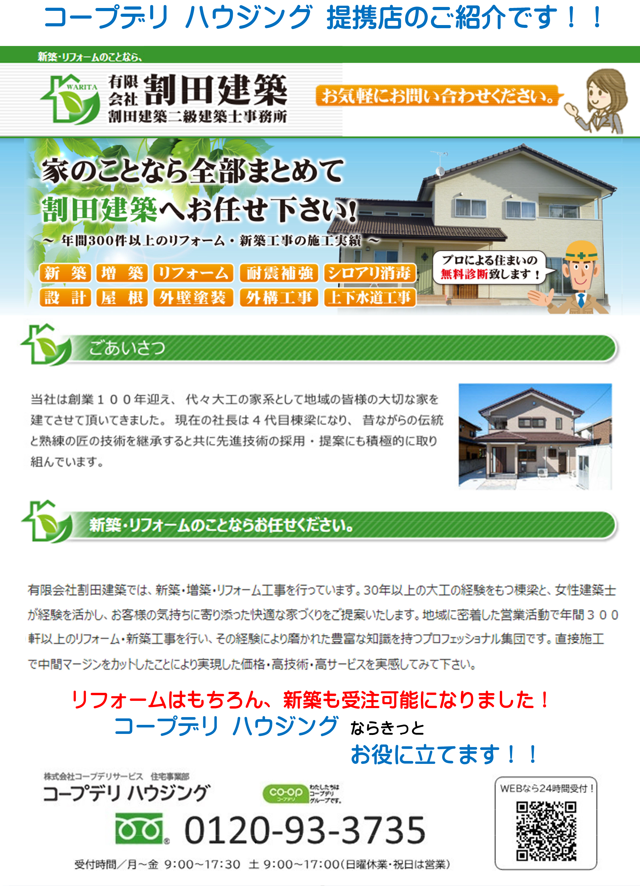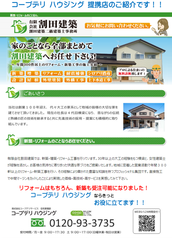 私たちコープデリハウジングはコープデリ生活協同組合連合会の子会社(株)コープデリサービスによる住宅事業です。これまでコープの築いた「安心・信頼」をリフォーム事業の中でも積み上げております。「小さな困りごと」から「大きなお悩み」までお気軽にご 相談下さい。「大切なご家族といつまでも安心して住み続けられる」を応援させていただきます。