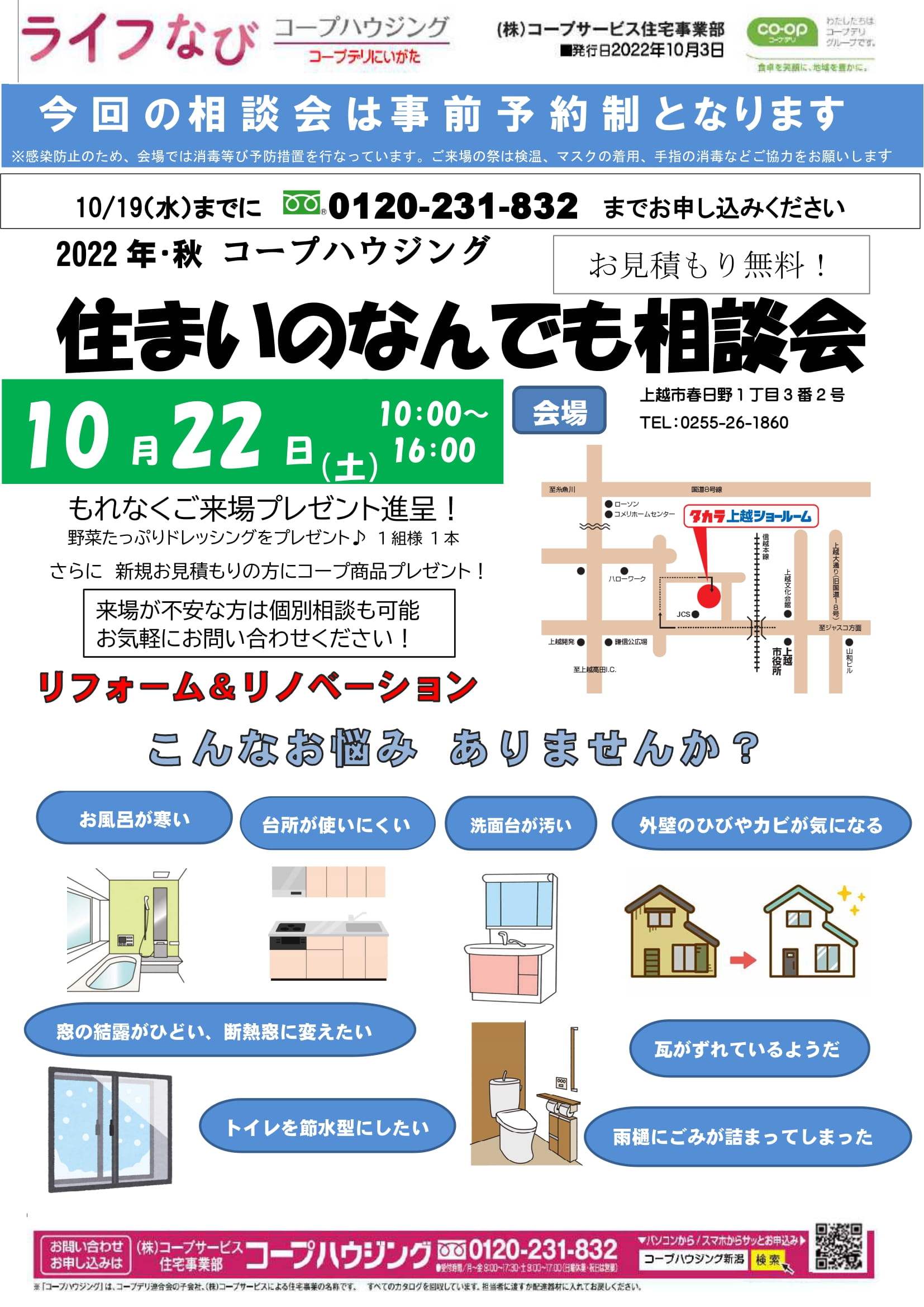 HOME各エリア情報新潟新潟 住まいのなんでも相談会 10月22日(日) タカラ上越ショールーム 新潟 住まいのなんでも相談会 10月22日(日) タカラ上越ショールーム 投稿日:2022年10月3日 画面をクリックすると大きな画面に移動します 最新の投稿 新潟 2026年1月 営業所ブログ 長野 2026年1月 営業所ブログ 群馬 2026年1月 営業所ブログ 茨城 2026年1月 営業所ブログ 千葉 2026年1月 営業所ブログ 埼玉 2026年1月 営業所ブログ 東京 2026年1月 営業所ブログ 新潟 2025年12月 営業所ブログ 長野 2025年12月 営業所ブログ 群馬 2025年12月 営業所ブログ カテゴリー 東京 埼玉 千葉 茨城 群馬 長野 新潟 月別アーカイブ 2026年1月 2025年12月 2025年11月 2025年10月 2025年9月 2025年8月 2025年7月 2025年6月 2025年5月 2025年4月 2025年3月 2025年2月 施工事例 施工事例一覧 内装 外装 水回り 組合員の声 組合員の声一覧 カテゴリーなし お役立ち情報 暮らしに役立つ情報 リフォームメニュー表 毎月発行チラシ『ライフなび』 シロアリ防除について アフターフォロー お問い合わせ・お申し込みからお支払いまでの流れ よくある質問 お問い合わせ お問い合わせ 各エリアの情報はこちら 各エリア情報 東京 埼玉 千葉 茨城 群馬 長野 新潟 その他の情報はこちら チケット くらしのサービス 葬祭